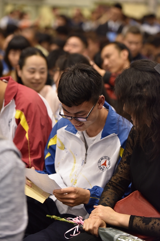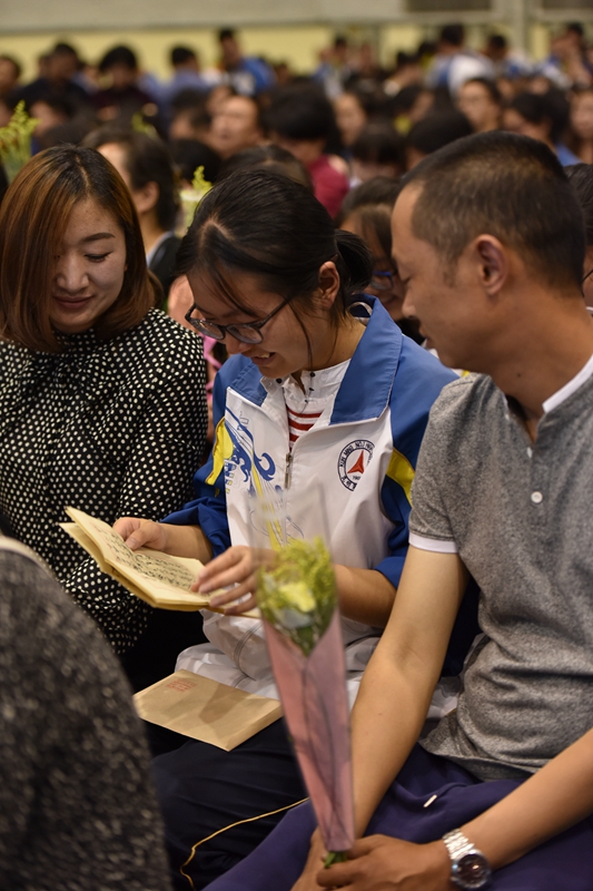 之后的同学献花环节,我们望向父母,一朵康乃馨换来了一封父母的家书。花朵娇嫩,家书沉甸,深情的目光背后,是我们跌跌撞撞十八载的感恩之情,更是父母殷切的牵念之思。花儿虽小,感恩无尽;书信或薄,纸短情长。