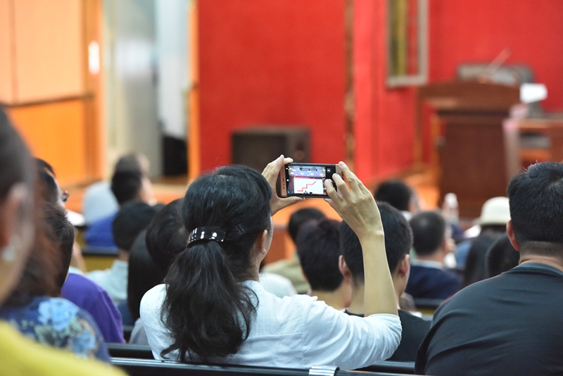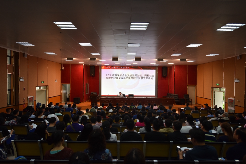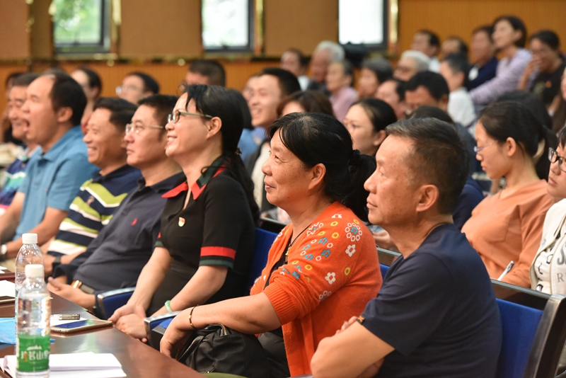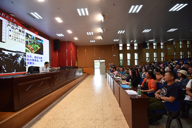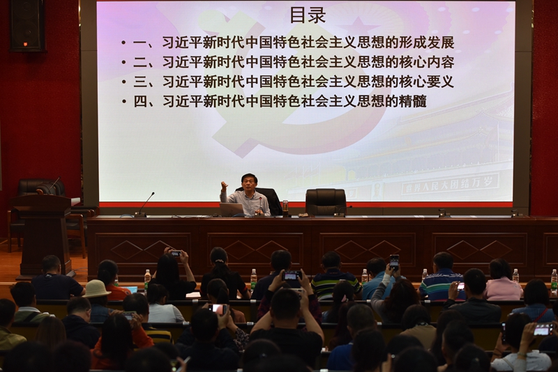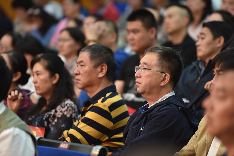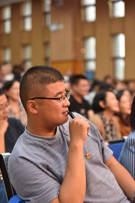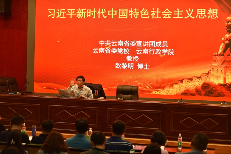 随后,由省委宣讲团成员、云南省委党校副校长欧黎明教授作题为《习近平新时代中国特色社会主义思想》的报告会。欧教授紧紧围绕习近平新时代中国特色社会主义思想的形成发展、核心内容、核心要义、精髓四个方面阐述了习近平新时代中国特色社会主义思想这一主题。欧教授旁征博引、风趣幽默,用生动的案例、透彻的分析,从身边切实可感的或细微或巨大的现实变化,向我们揭示了新时代是中华民族从站起来、富起来到强起来的伟大飞跃。欧教授强调,学习习近平新时代中国特色社会主义思想,要在领会基本内容的同时,深入理解和掌握贯穿其中的精髓要义,习近平新时代中国特色社会主义思想的精髓,就是为人民谋幸福、为民族谋复兴、为世界作贡献,这集中反映了当代中国共产党人的人民立场、民族抱负、世界立场。在谈到“四个自信”尤其是文化自信时,欧教授对这一更基本、更深沉、更持久的力量深有感触,也对基层学校在立德树人中不断树立学生的文化自信,强化文化担当寄予了厚望。