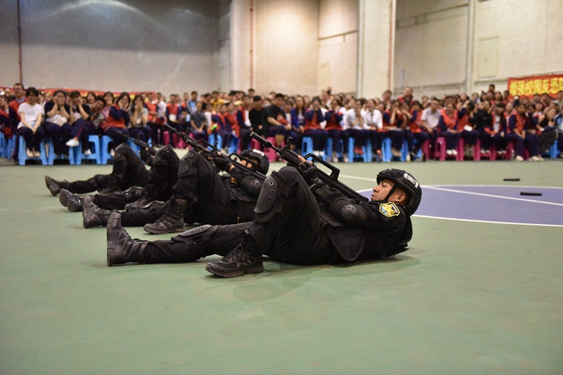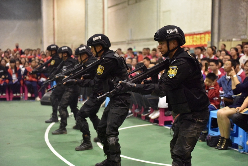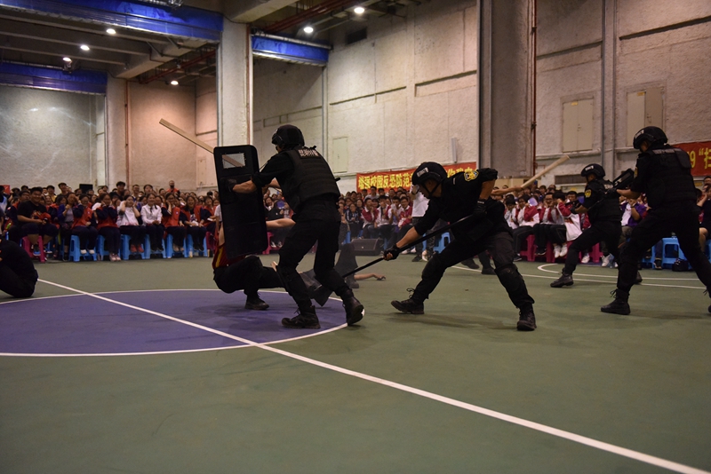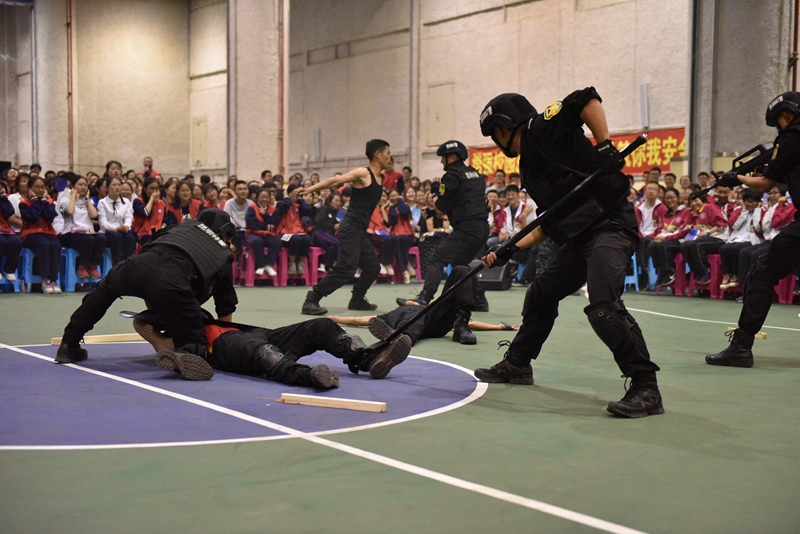特警支队云豹突击队的队员分别进行了反恐处置科目、特警小组战术演练,向广大师生展示了昆明警方开展扫黑除恶专项斗争和反恐防恐工作的能力和决心,精彩的实战演练赢得了全校师生的喝彩。