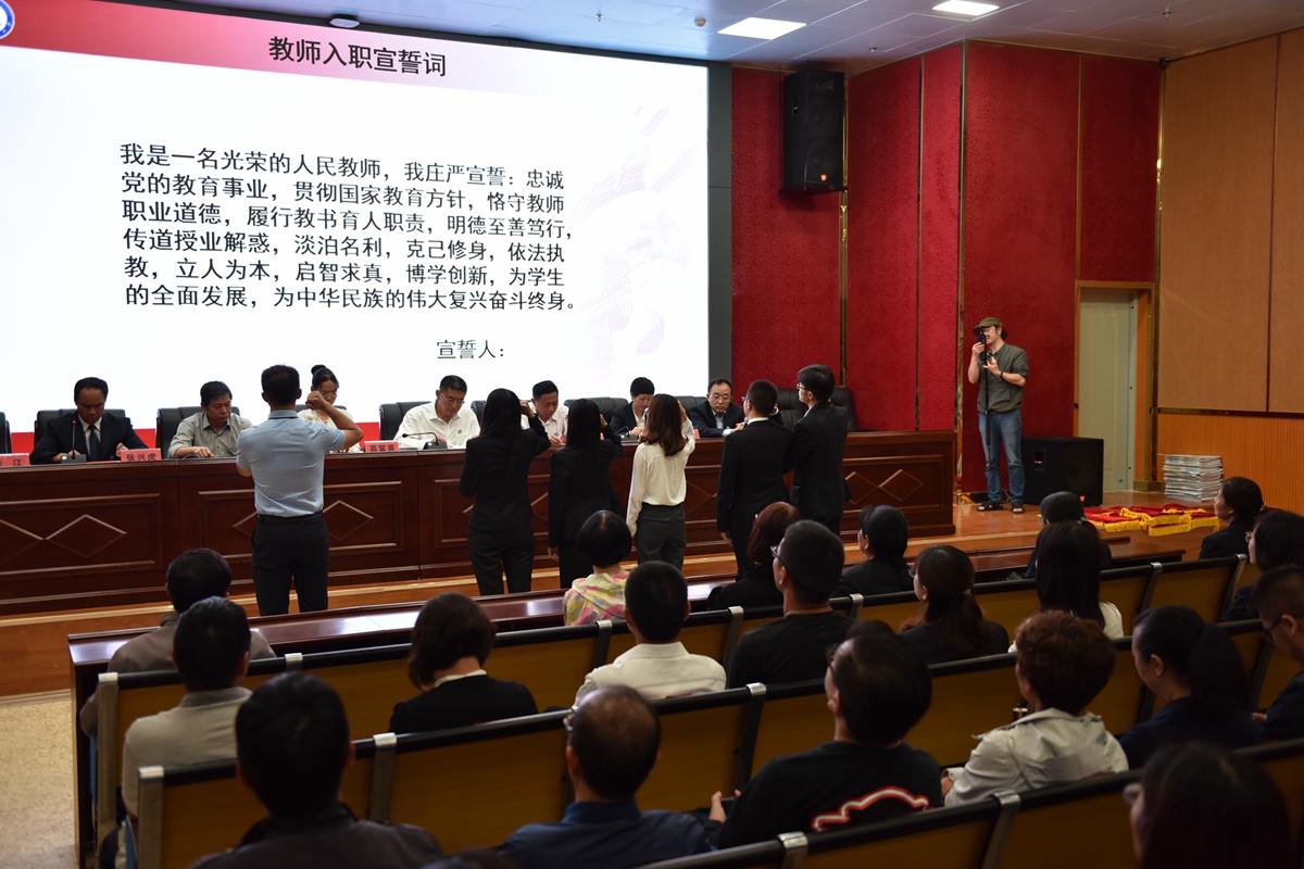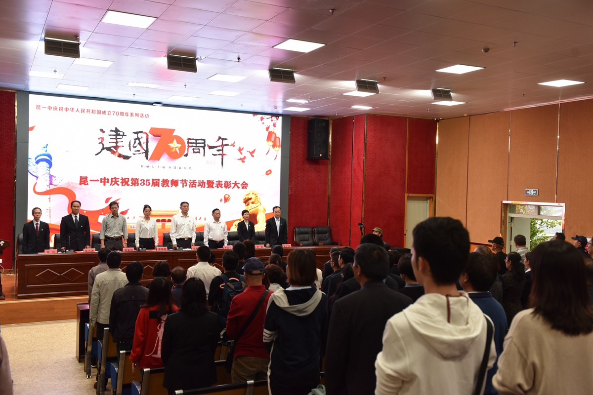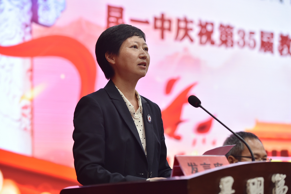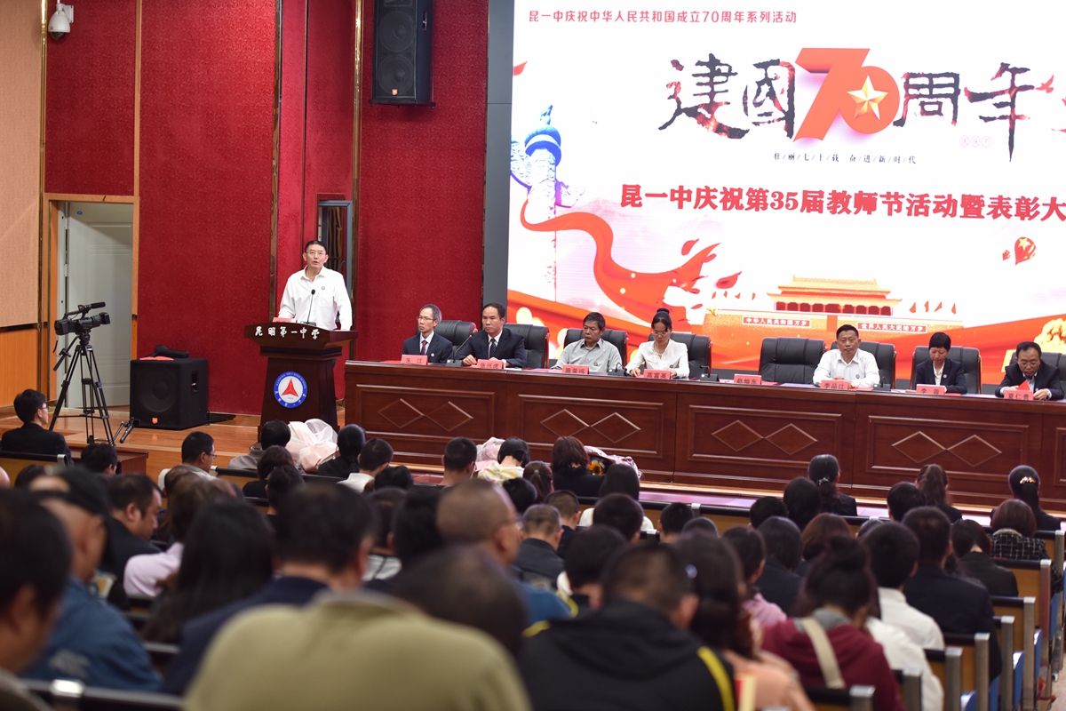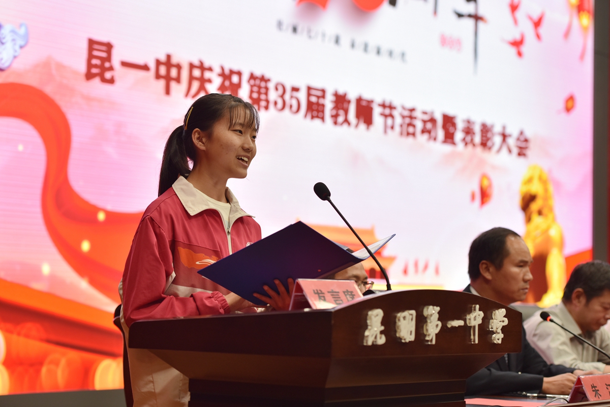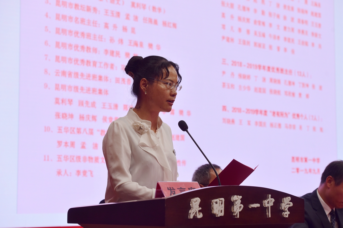 2019年9月10日下午,我校庆祝第35个教师节暨表彰大会在综合楼报告厅举行。和千百个陪伴学生的日子一模一样,今天,老师们也是在讲台上,在案桌上度过了平凡的一天。但今天又是不一样的,今天是老师们自己的节日,是对为人师表品格的肯定和褒扬。高二理13的李星蓉代表全体同学表达了对老师们的喜爱与感恩,感恩老师们的悉心守护与陪伴成长。“您默默奉献,却不求回报。可能您或已咽喉肿痛,静脉曲张,但您却不声不响……根据牛顿第三定律力的作用是相互的,那么我上辈子是不是拯救了世界,宇宙才让我遇见一个这么好的您。”今年刚入职的五位新老师右拳过肩、郑重宣誓:“恪守教师职业道德,履行教书育人职责,明德至善笃行,传道授业解惑。”赵校长、高书记为新老师戴校徽、正衣冠。教学副校长李蓉向新教师致贺词,昆华园因你们的到来而更加勃勃生机,并希望新老师了解一中,了解她的过去、现在,因了解而自信,因了解而热爱,畅想她的未来;努力完善自己的知识储备,了解自己所教学科;处理好教育与技术的关系。2019年杜青、张团仙、彭建琼、魏凌霄、谢辉老师光荣退休,新老师为退休教师送上鲜花,是欢送,亦是传承。90余位受省市区、学校表彰的优秀班主任、优秀教育工作者等接受了表彰。优秀教师代表田茂香老师发言,感慨了她对昆华园的情怀,我们的校园被时间“渐渐”改变着面貌。然而,不变的是园中“一堂师友亲爱精诚”,是“师生学养的真且纯”;是日复一日教育教学中那些最繁琐而可贵的细节,以及由此沉淀而来“诚敬勤朴,公勇严毅”的精神品格。最后赵校长总结讲话,人类文明的进步离不开师者情怀。这一大批对教育、对岗位、对学校、对学生、对生活都充满了热爱的教师们撑起了百年一中的这片天空。我也常常会想什么是做教师的幸福?教师的幸福来自良心,来自发乎肺腑的对学生的爱,不忍心放弃每一个学生;教师的幸福源于理想,来源于价值感……习总书记说:“一个人遇到好老师是人生的幸运,一个学校拥有好老师是学校的光荣,一个民族源源不断涌现出一批又一批好老师则是民族的希望。”我们会用自身的平凡去换取国家未来人才的伟大,我们会用自身的敬业去换取明天改变社会的栋梁。