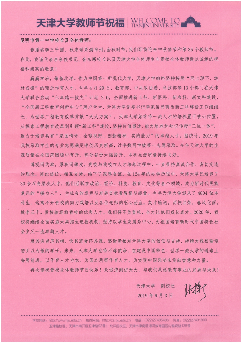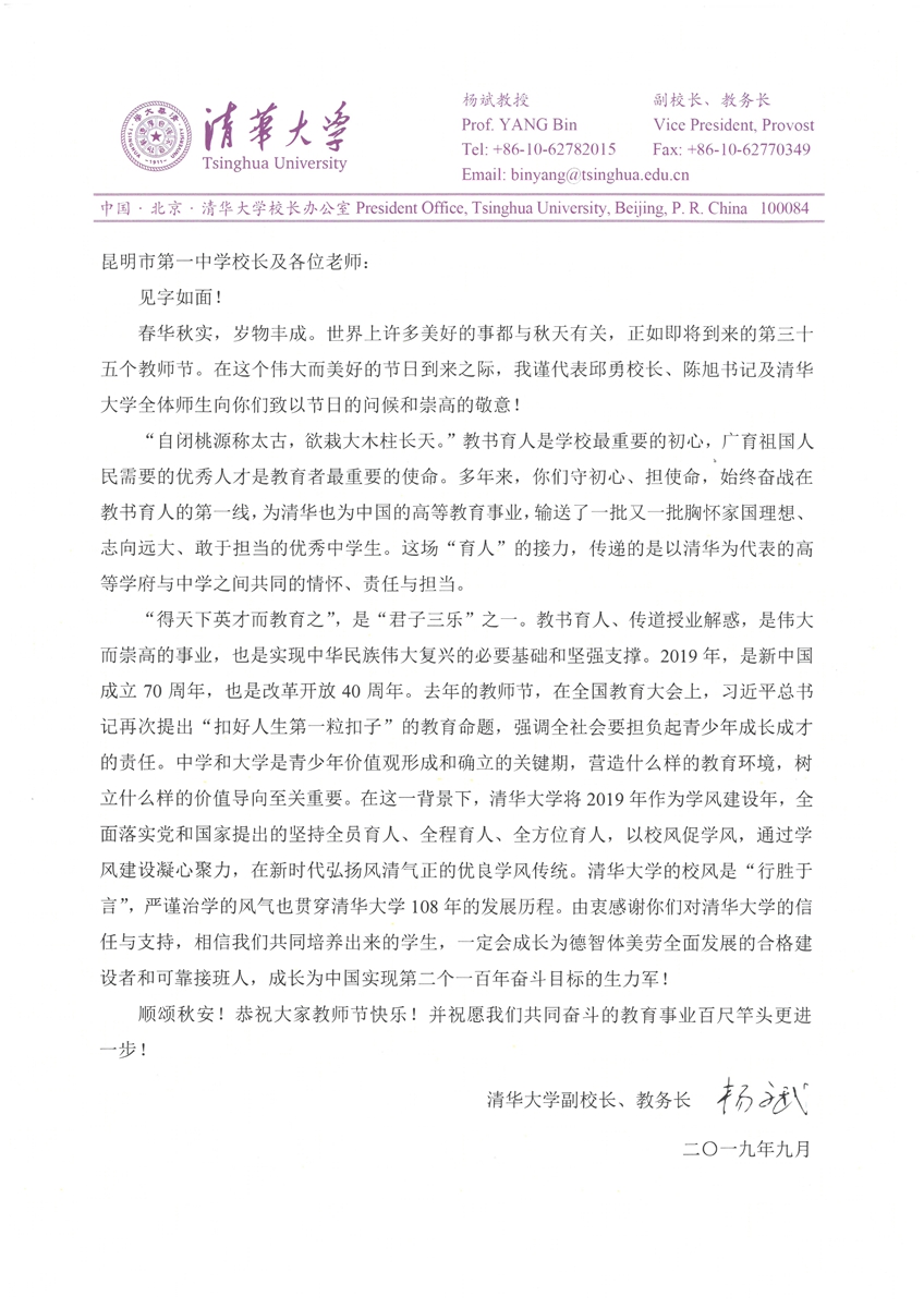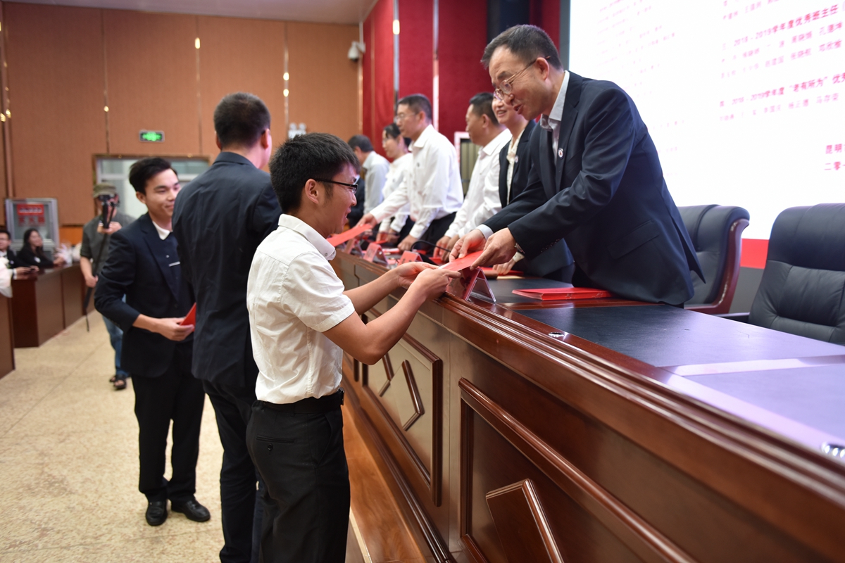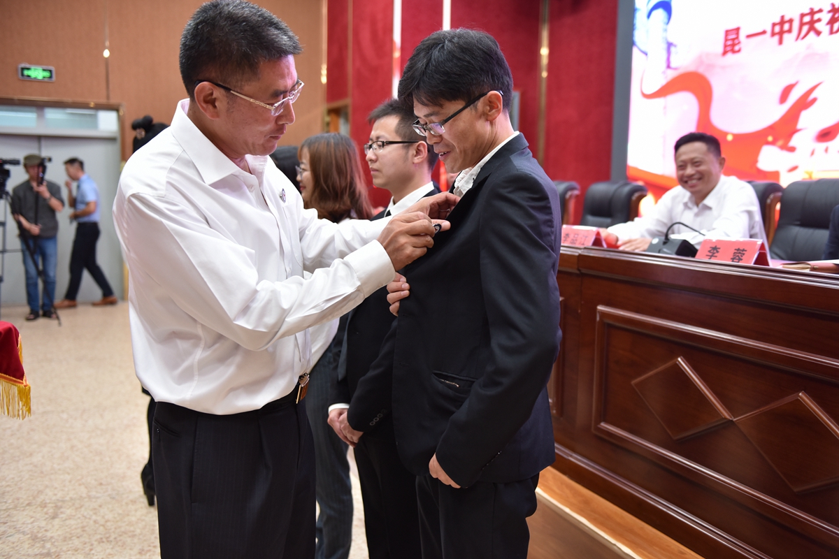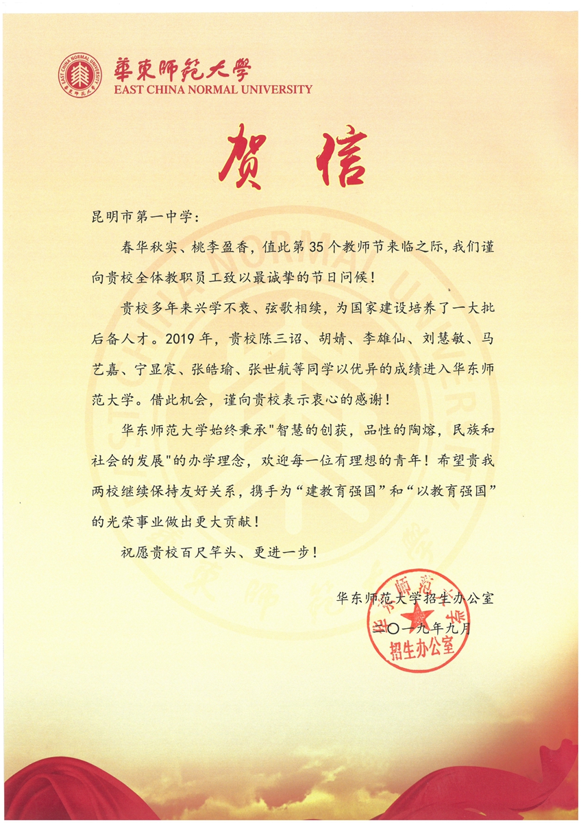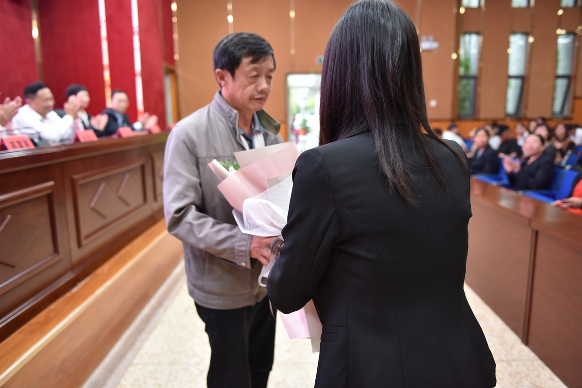 2019年9月10日下午,我校庆祝第35个教师节暨表彰大会在综合楼报告厅举行。和千百个陪伴学生的日子一模一样,今天,老师们也是在讲台上,在案桌上度过了平凡的一天。但今天又是不一样的,今天是老师们自己的节日,是对为人师表品格的肯定和褒扬。高二理13的李星蓉代表全体同学表达了对老师们的喜爱与感恩,感恩老师们的悉心守护与陪伴成长。“您默默奉献,却不求回报。可能您或已咽喉肿痛,静脉曲张,但您却不声不响……根据牛顿第三定律力的作用是相互的,那么我上辈子是不是拯救了世界,宇宙才让我遇见一个这么好的您。”今年刚入职的五位新老师右拳过肩、郑重宣誓:“恪守教师职业道德,履行教书育人职责,明德至善笃行,传道授业解惑。”赵校长、高书记为新老师戴校徽、正衣冠。教学副校长李蓉向新教师致贺词,昆华园因你们的到来而更加勃勃生机,并希望新老师了解一中,了解她的过去、现在,因了解而自信,因了解而热爱,畅想她的未来;努力完善自己的知识储备,了解自己所教学科;处理好教育与技术的关系。2019年杜青、张团仙、彭建琼、魏凌霄、谢辉老师光荣退休,新老师为退休教师送上鲜花,是欢送,亦是传承。90余位受省市区、学校表彰的优秀班主任、优秀教育工作者等接受了表彰。优秀教师代表田茂香老师发言,感慨了她对昆华园的情怀,我们的校园被时间“渐渐”改变着面貌。然而,不变的是园中“一堂师友亲爱精诚”,是“师生学养的真且纯”;是日复一日教育教学中那些最繁琐而可贵的细节,以及由此沉淀而来“诚敬勤朴,公勇严毅”的精神品格。最后赵校长总结讲话,人类文明的进步离不开师者情怀。这一大批对教育、对岗位、对学校、对学生、对生活都充满了热爱的教师们撑起了百年一中的这片天空。我也常常会想什么是做教师的幸福?教师的幸福来自良心,来自发乎肺腑的对学生的爱,不忍心放弃每一个学生;教师的幸福源于理想,来源于价值感……习总书记说:“一个人遇到好老师是人生的幸运,一个学校拥有好老师是学校的光荣,一个民族源源不断涌现出一批又一批好老师则是民族的希望。”我们会用自身的平凡去换取国家未来人才的伟大,我们会用自身的敬业去换取明天改变社会的栋梁。