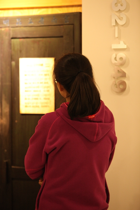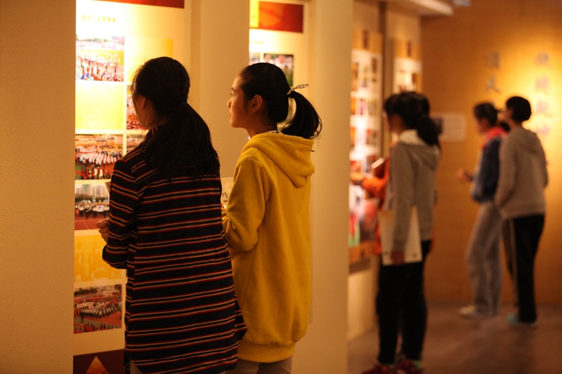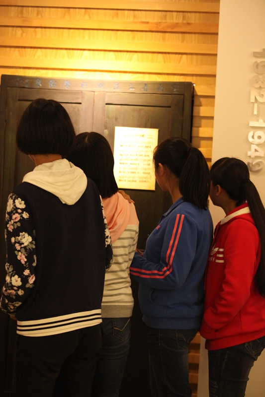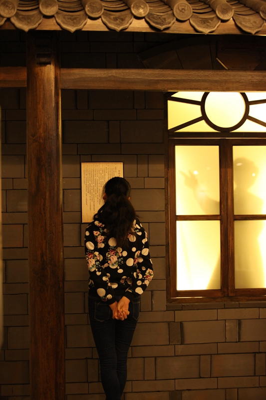 在照片的顶侧,就是校史馆透过日光下的影子,所重现的一幅教学场景,一位短发披肩的年轻女教师,手拿粉笔,正望着她的学生,也许正在询问问题吧,所能看见的,三两个学中一个正在端坐倾听,而另一个则高举着小手,将自己代入这样和谐的场景,让我感受到了浓浓的温暖。