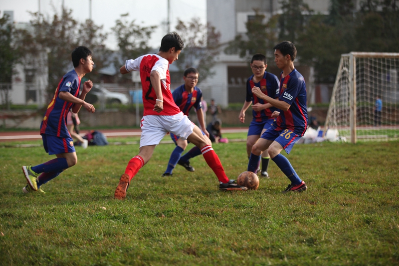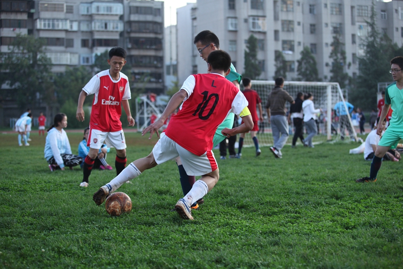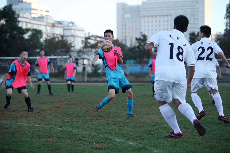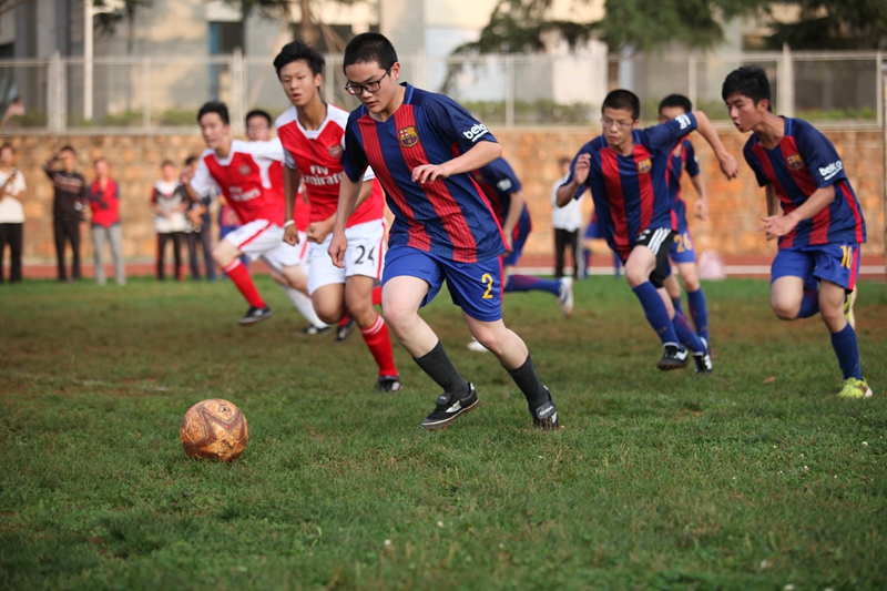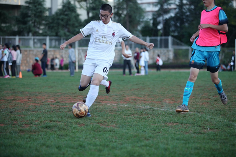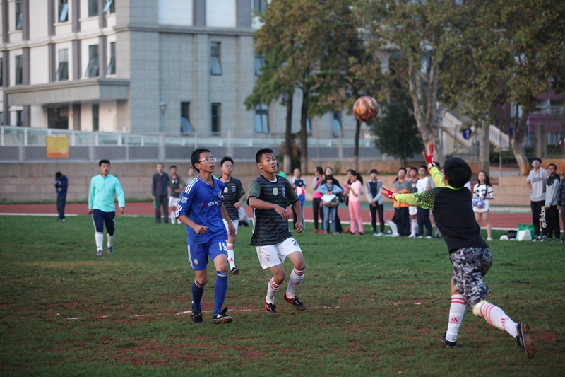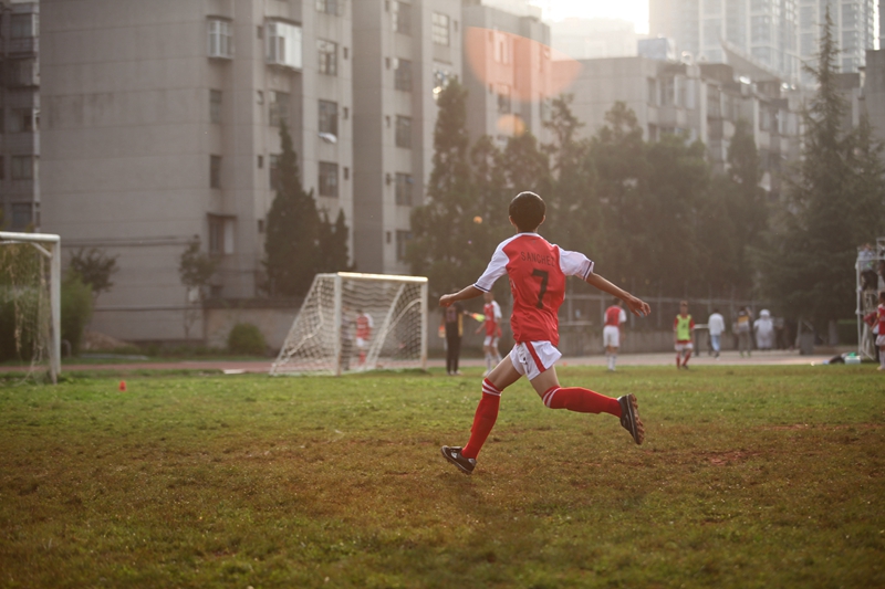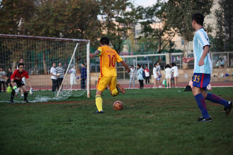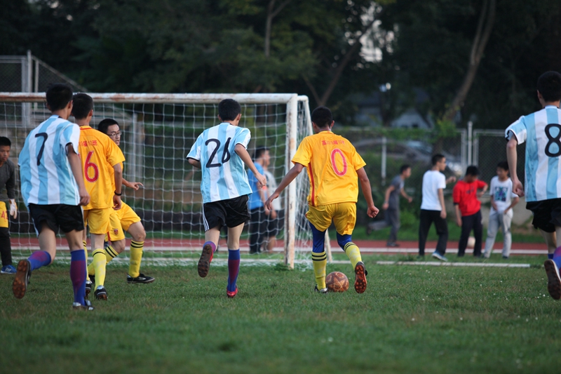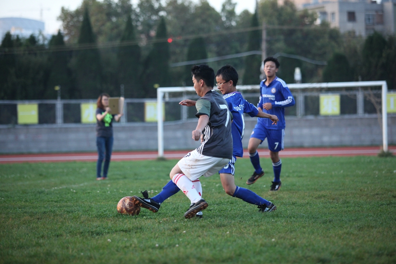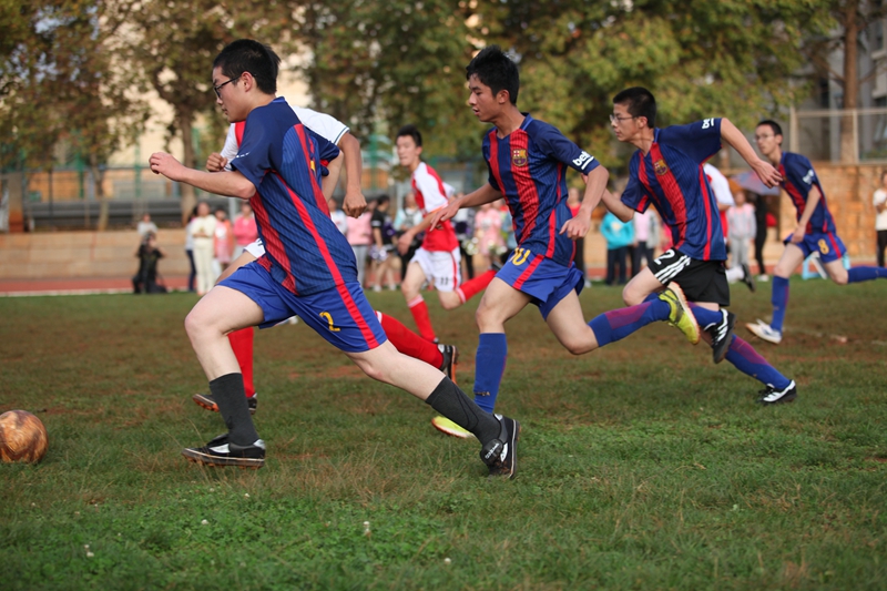 夕阳抚过金黄的树叶,留下树影斑驳。斑驳树影旁,时有身影疾驰而过,那正是绿茵场上奔跑的少年。尽管训练时间紧迫,肩负赢得班级荣誉的重任,队员们依旧从容不迫。赛前,留给同学们的,是他们坚定的背影。