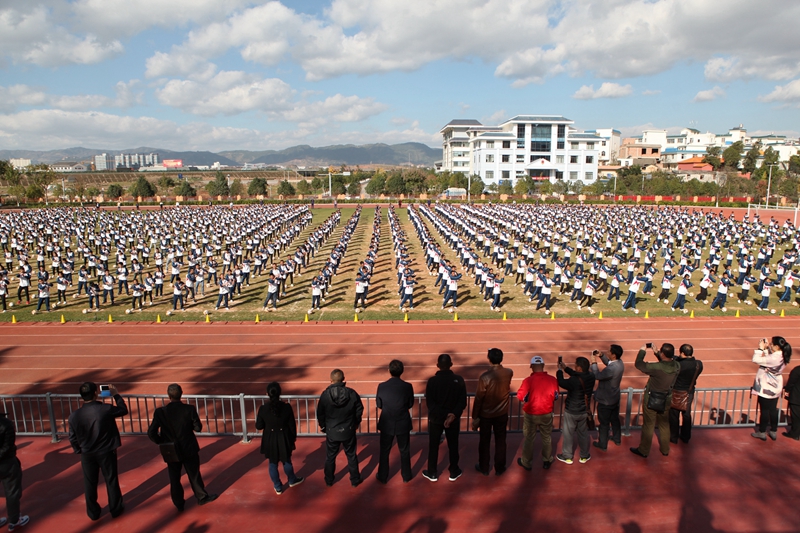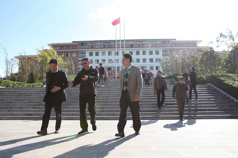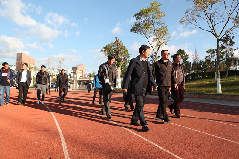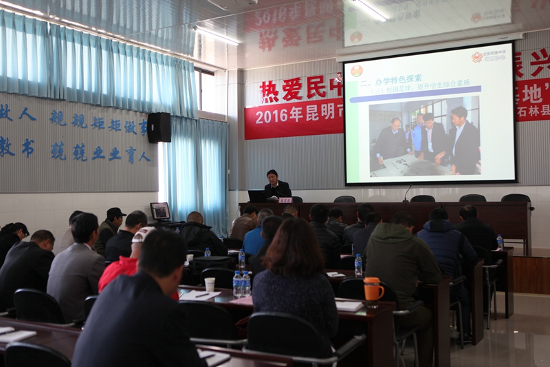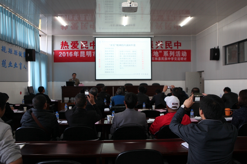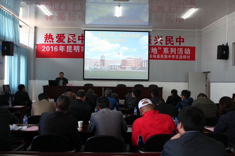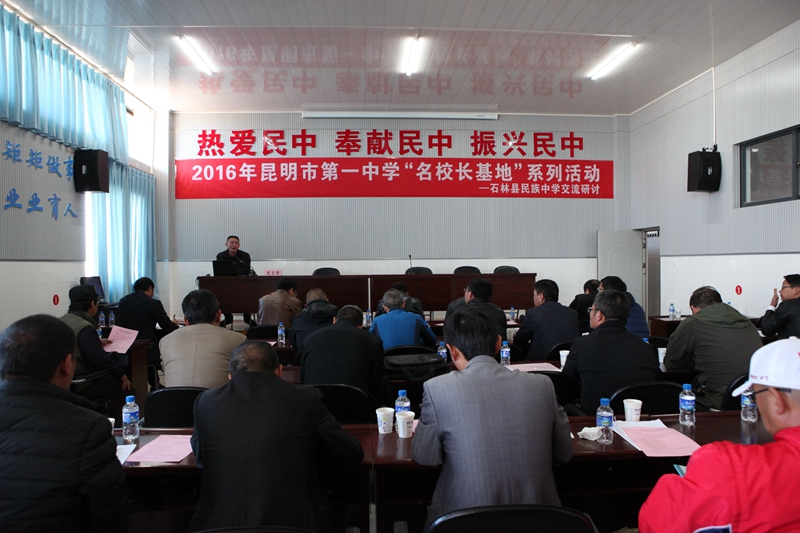 2016年11月25日,昆明市第一中学“名校长基地”交流研讨活动在石林民族中学举行。来自昆十中、滇池中学、两区轿子山实验中学、昆一中西山学校、晋宁二中等学校的二十余位学员校长齐聚石林民族中学。在昆明市第一中学名校长基地主持人赵校长的率领下一行人参观了石林民族中学校园。石林民族中学到位的宿舍管理给学员校长们留下了深刻印象,值得我们借鉴和学习。石林民中课间操民族特色非常突出。赵校长一行观看了石林民中课间“足球操”和“大三弦”表演。