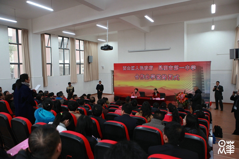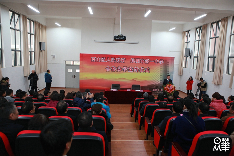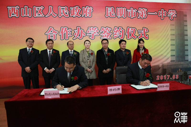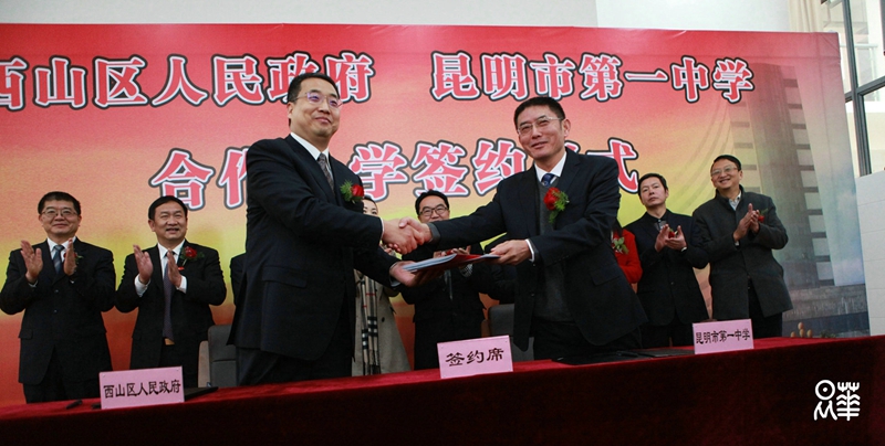 在到会相关领导见证下,昆一中与西山区人民政府合作办学协议由西山区区委副书记、区长郭希林与昆明市第一中学校长赵灿东完成签字仪式。