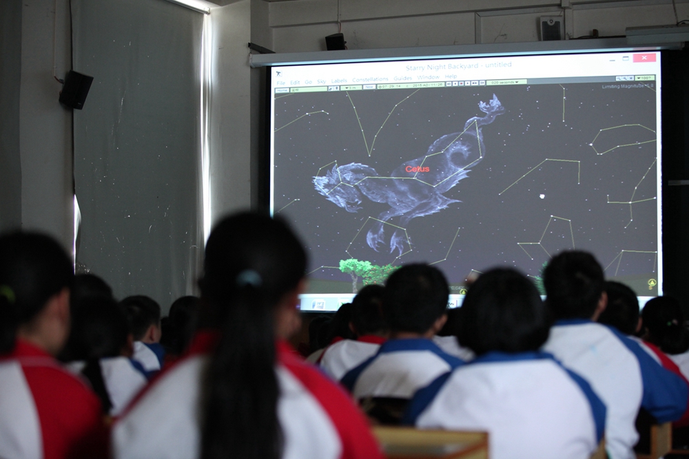 同学们在杨老师的带领下认识星座。高傲的人马座,展翅翱翔的天鹰座,仰天长啸的天龙座,猎手座跨过世界的彼端。