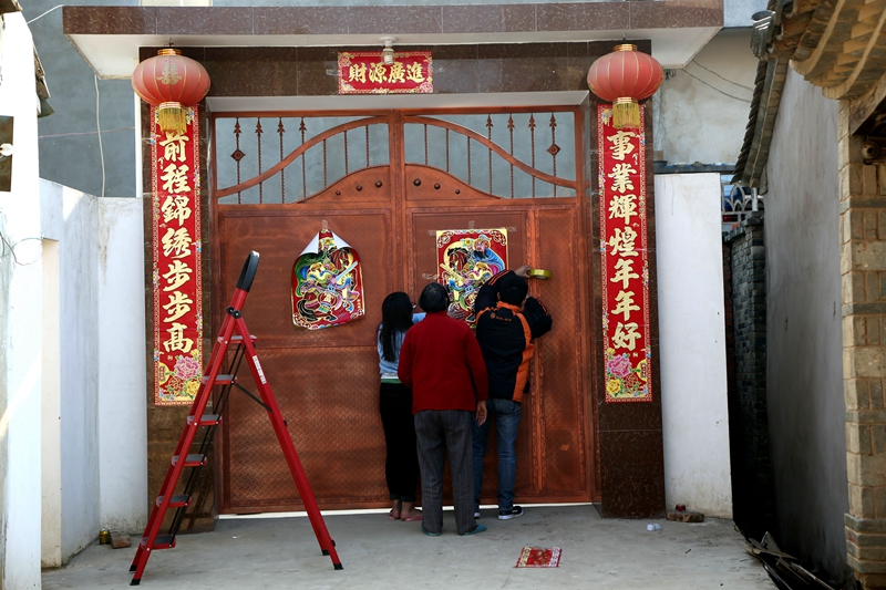 祖孙一起贴门神,传统习俗在无声地传承着。门前的架子,地上的春联残片,画面乍看凌乱,却瞬间让你有身临其境之感,非常生动。