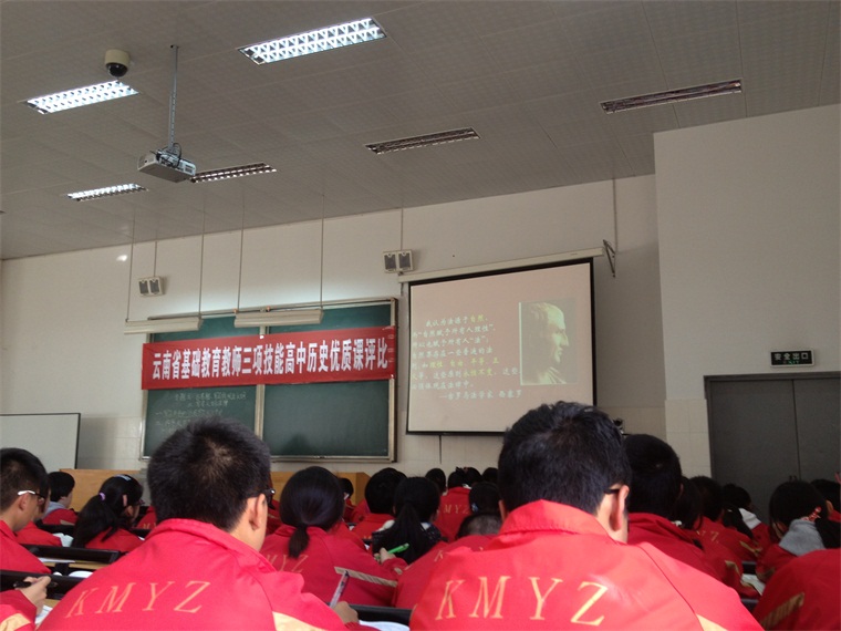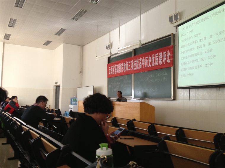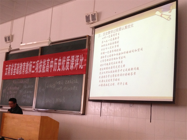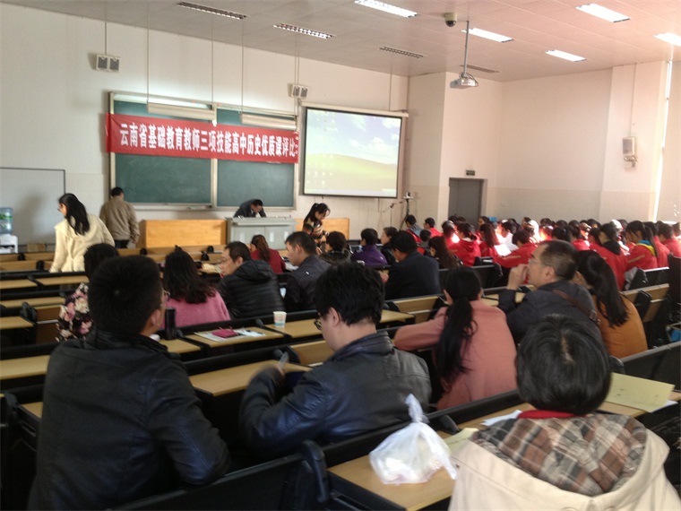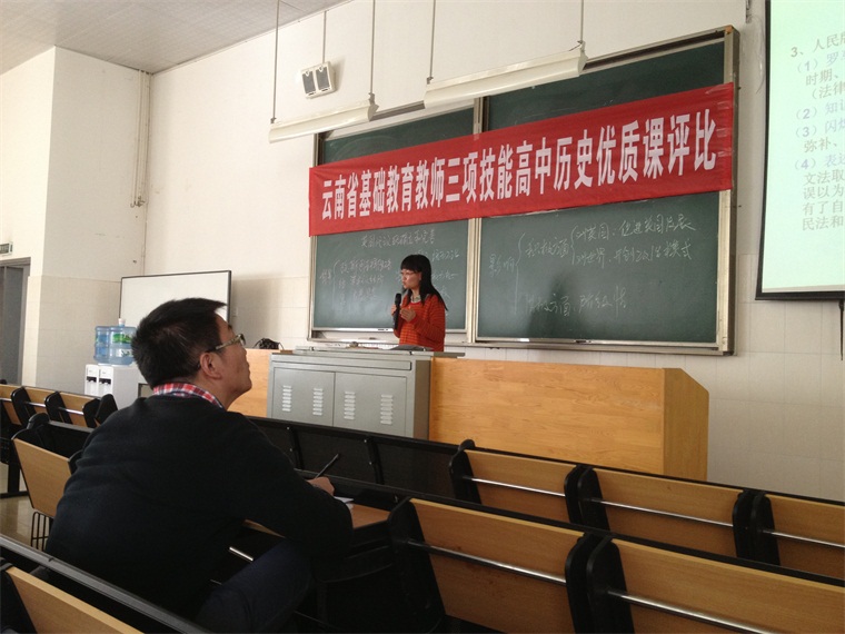 2014年11月25日-27日,“云南省基础教育教师三项教学技能高中历史教师优质课评比暨教学研讨活动”在我校举行,我校历史组胡新荣老师代表昆一中参加了此次优质课评比活动。来自全省各地的选手共有18位,观摩人数达100多人。