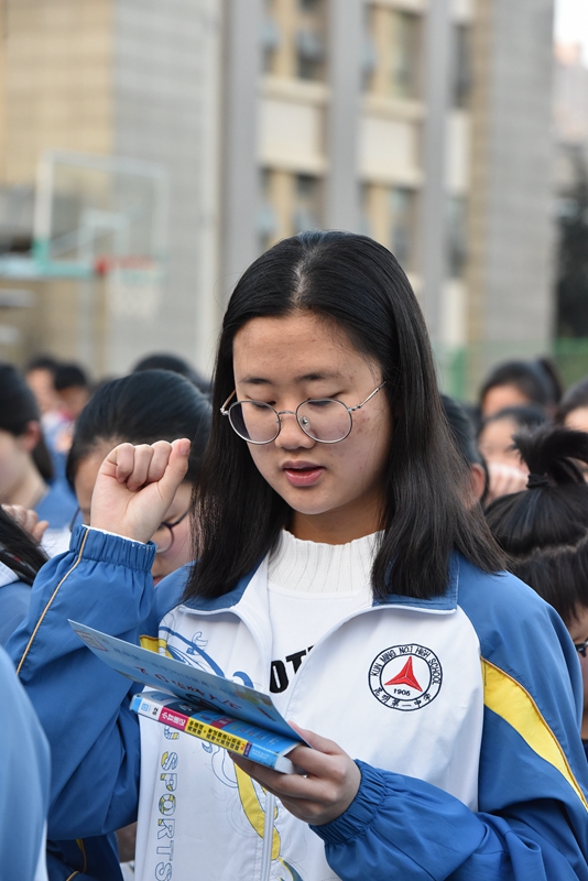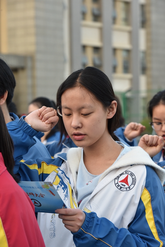 时光如梭,好像昨天才跨入校园,今天却已站在高考誓师的队伍里。德育副校长施荣鸣首先致辞,送给不到一百天就将进入高考考场的我们两句话:“减轻包袱,轻装上阵”“劳逸结合,提高效率”。高考是知识、能力与心态的综合较量,在最后的冲刺阶段,每个人都想为梦想奋力一搏,所以保持良好的心态尤为重要。年级组长李兴荣老师说道:“自信是成功的第一秘诀。信其行则必行,信其成则必成。”我们身后是一中,有老师的支持与鼓励,有得天独厚的学习环境,必定有十足的信心在高考中绽放出万丈光芒。铿锵有力的誓言声是一中学子必胜的信念和决心:“竭尽全力,超越自我!我们一定能!”