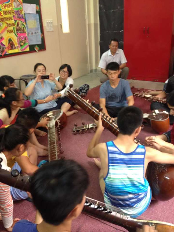 之后我们还参观了学校的校舍,学校建筑不高,校园不大,但安排非常合理,很紧凑。每个班的学生人数不超过二十人,学生可根据自己的兴趣爱好选择要学的课程。走廊两边陈列着学生自己的作品,让人印象深刻。美术教室外面,摆着一个易拉罐做的雕塑,是一个废物利用的工艺品,既个性又环保。我们去上了瑜伽课,感受了真正的瑜伽,在印度,不管什么年龄段的学生都要上瑜伽课,因为这是他们古老文明的一部分。学校管理严格,规定学生穿校服、黑色鞋子,女生可以穿裙子,但必须扎头发。交流期间我校师生参与体验了瑜伽课、美术课、音乐课、物理实验课,烹饪课……感受到了印度传统文化的魅力,还自己创作有印度特色的绘画作品。物理实验课上, 印度 老师展示了他们的教学视频,让学生们看到了不一样的教学方法,了解了不一样的校园文化。 印度 老师注重学生的全面发展,学生们有很多的课外活动。我校学生还受邀观看了友好学校孩子们的舞台剧,看到低年级的学生在舞台上自然的表演,一起上音乐课,一些学习方式,教育模式的差异给他们留下了深刻的印象。