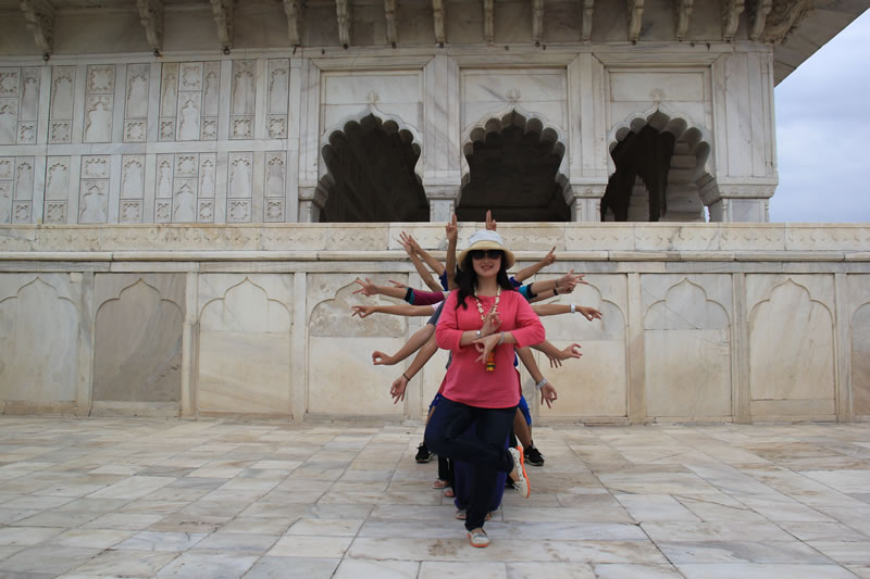 我们一早出发去阿格拉-泰姬陵,一路上干净的高速公路,没有收费站,坐了大概四个小时的车,终于到达阿格拉。破旧的城市,让学生们大吃一惊,与古尔冈完全不一样,随处可见的苦行僧,穿着破旧的衣服,赤脚徒步去朝拜心中的圣殿。关于泰姬陵的故事:莫卧儿王朝皇帝沙杰汗的爱妃蒙泰吉˙马哈尔娇艳美丽,才华过人,在随同沙杰汗出巡的途中不幸去世,时年39岁。为纪念与之形影不离的爱妃,沙杰汗征调2万多名民工建造了这座陵墓。