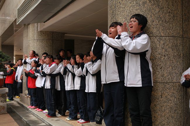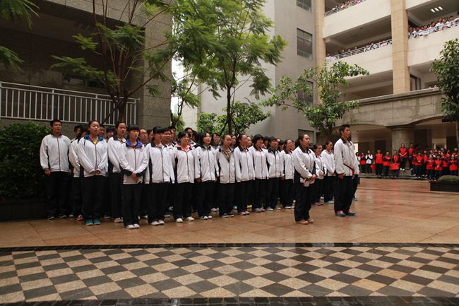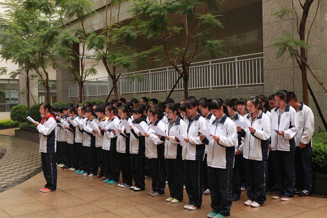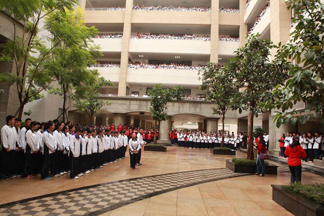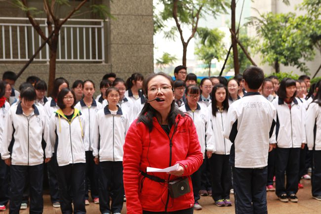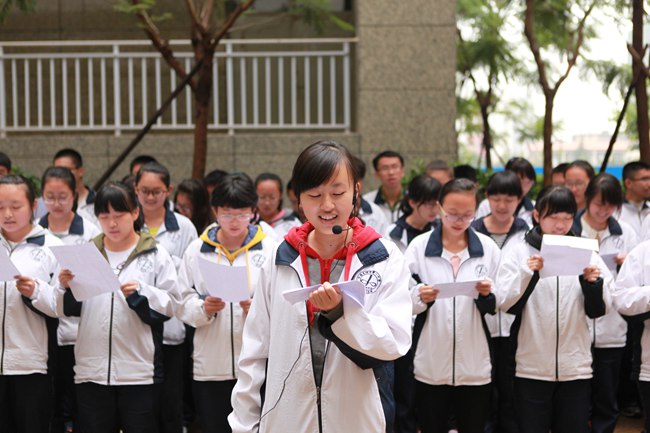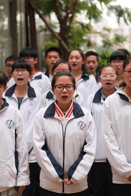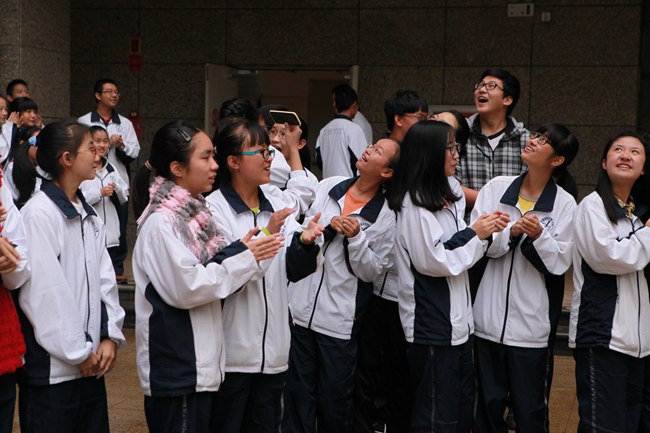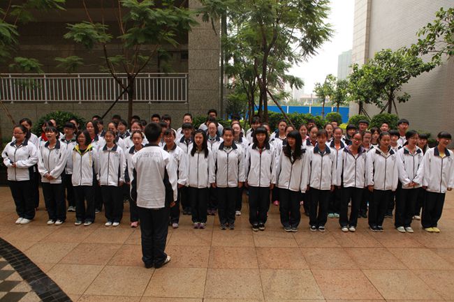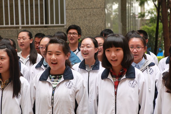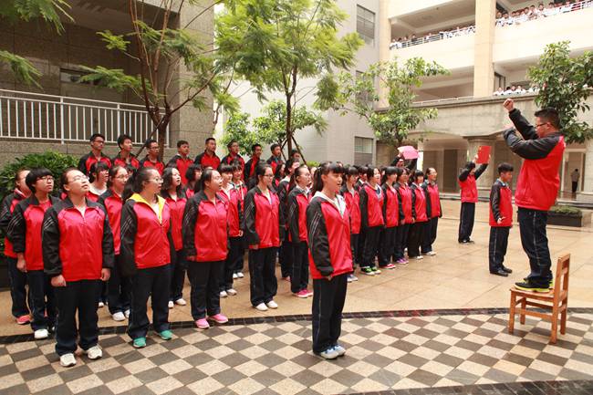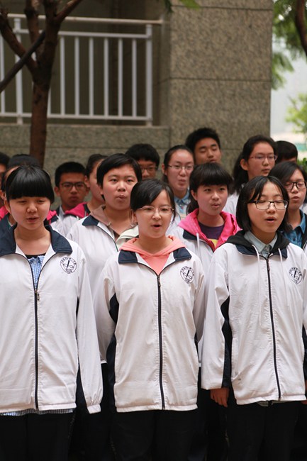 2014年9月25日课间操时间,高2016届在教学楼前的空地上举行了“不插电演唱会”——“歌唱祖国”歌咏比赛。虽然没有华丽的舞台,可是同学们热情不减,五个文科班率先表演,先后唱响了《打起手鼓,唱起歌》、《十送红军》、《北京欢迎你》、《歌唱祖国》等一首首经典歌曲。教学楼楼道天然地成为观看演出的最佳位置,同学们纷纷为文科班的精彩演出热烈地为鼓掌、呐喊。