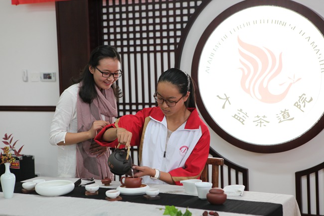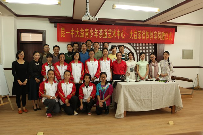 2014年9月28日下午,昆一中大益青少年茶道艺术中心暨大益茶道体验室捐赠仪式举行。赵灿东校长在致辞中表示,感谢大益基金会以及大益茶道院对昆一中的关爱和支持。昆一中一贯倡导学生的全面发展,茶道艺术中心的落成将为学生发展爱好创造良好的条件。茶文化源远流长,我校将把“青少年茶道课程”作为校本课程开设,让学生在此过程中学习茶的文化、水的文化。在茶道的学习中,感悟和回味中国文化,捧一杯清茶,品一卷诗书。大益爱心基金会领导李占文发言说,百年历史名校见证了大益茶第一所青少年茶道艺术中心的落成。茶文化是中国文化独特的文化符号,在高中生中开展茶道的学习、宣传,希望茶文化这片美丽的叶子发扬光大。赵灿东校长和大益爱心基金会领导共同为大益青少年茶道艺术中心、大益茶道体验室揭牌。大益茶道院“青少年茶道课程”授课教师杨明容老师向我校赠送相关文化书籍。在清丽的古筝演奏中,大益茶道院老师进行了“大益八式”茶道表演。杨明容老师还现场指导三位同学体验了茶器的使用、如何行茶礼。