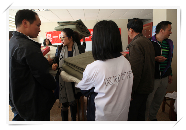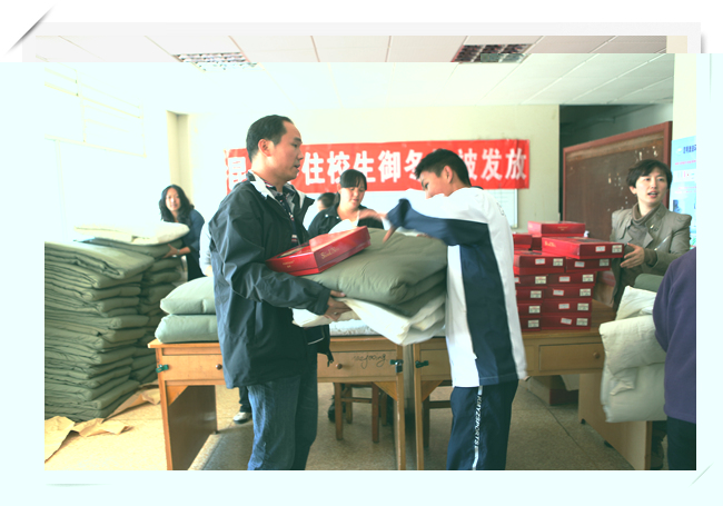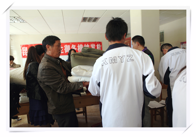 2013年11月13日中午,学校女生公寓一楼大厅,整齐地堆放着棉被、褥子、保暖内衣。这是昆一中一年一度举行的为贫困学子发放御冬物品。经过生活老师的认真调查了解,学生工作处审核,来自2016届的57位同学,领到了一床被子、一床褥子、一套保暖内衣。为了让同学们拿到的保暖内内衣合身舒适,学生工作处事先统计了同学们的身高,这样的贴心之举无疑让同学们感受到了更多的温暖。