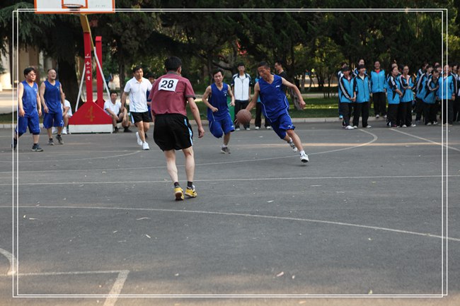 2014年4月15日下午5:20,昆一中2014年春季教职工篮球赛第三场高一年级对阵高三年级,第四场高二年级对阵金岸分校举行,经过激烈的角逐,高三年级、金岸分校分别取得了胜利。两周前第一场高一年级对阵高二年级,第二场行政对阵高三年级已经结束。为丰富我校教职工的课余生活,提高教职工的身心素质、增强体质,增进学校的凝聚力和团队协作精神,引导和激发广大教职工更好的参加体育活动,工会主办、体育组和校团委协办了本次春季教职工篮球赛,5支教职工代表队采用循环赛制。为了让每个球队的运动员都能参加到本次篮球比赛中来,本次比赛特规定第一节和第二节上场队员不得重复参加比赛,如因在比赛中犯规被罚出场或者参赛人员不足五人也只能是造成多打少局面,参加第二节比赛运动员不得参与第一节比赛运动员的替换,同样参加第一节比赛运动员不得参与第二节比赛运动员的替换,第三、四节比赛时本队球员才能自由组合。