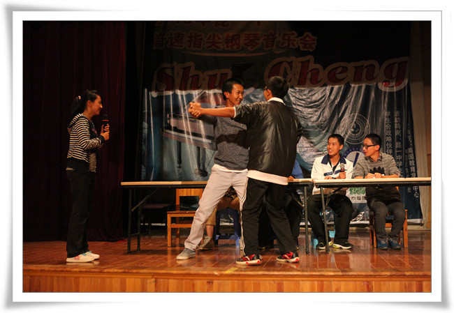 (记者:和赵雅丹 摄影:王倡剑)9月30日晚七点半,校学生会在报告厅举行了欢度国庆联谊活动。该活动旨在借欢乐笑闹之节目,让学生会新成员彼此增进感情,找到家的温馨感觉,促进学生会各部门间的交流与合作,从而使学生会今后的活动更高效地进行。宣传部成员率先带来串烧舞台剧《宣传部的马尾》,欢歌载舞间朝气蓬勃的青春气息扑面而来。随后各个部门相继秀出精心准备的高端大气上档次的节目。社团部的乐器合奏,体育部的歌曲串烧,秘书处的古装舞台剧,内联部的串烧歌舞,外联部的Hiphop齐舞。学习部编排演出的趣味辩论赛《社会更需要学霸还是学渣》使得全场的观众思维活跃起来,文艺部展示的歌舞节目则将文艺气息展现得淋漓尽致。晚会中,学生会主席吴壤西上台与学生会新老干部游戏互动,现场气氛更是欢乐爆棚,团委牟洁老师即兴献唱《红山果》又将晚会推上了一个新高潮。晚会在学生会主席、副主席优美的《我好想你》歌声中完美落幕。晚会虽已结束,同学们激动的心情久久难平。有同学表示“从原来的生疏,到现在的互开玩笑,我们一同经历了成为朋友的过程。”