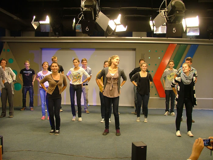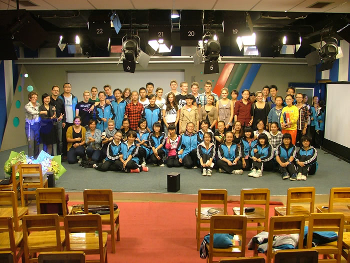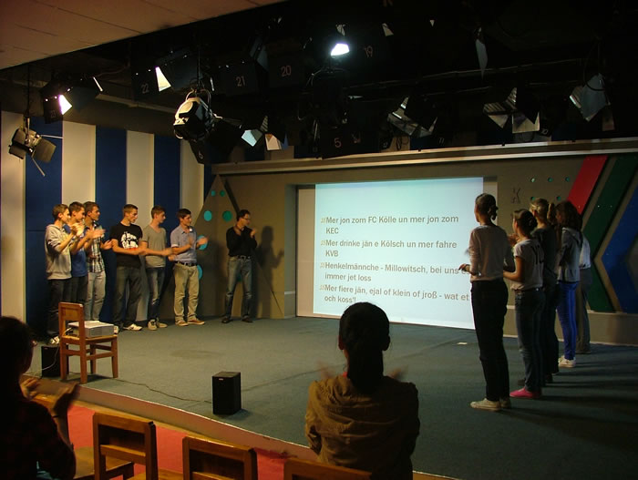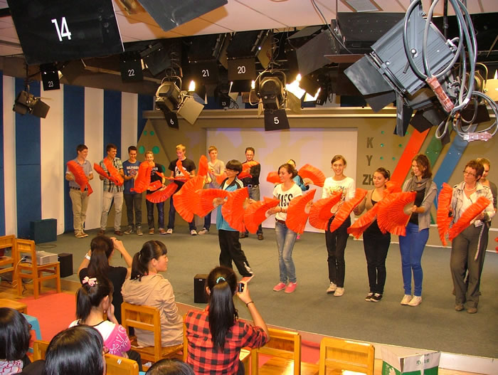 2012年9月20日下午5:30,即将结束对我校友好交流访问的德国ESG学校师生一行17人,在昆一中演播厅与德语班师生进行了联欢。联欢会气氛活泼、热烈。我校同学相继表演了民族舞蹈《剪纸姑娘》、《孔雀飞来》,以及动感、火爆的街舞秀,德语班同学还演唱了两首德语歌曲。联欢会互动频频,德国ESG学校师生展示了他们在访问期间学会的扇子舞。ESG学校带队教师还用新学会的葫芦丝演奏了一首德国歌曲。联欢会在中德师生一起欢跳舞蹈《火把节》中结束。
