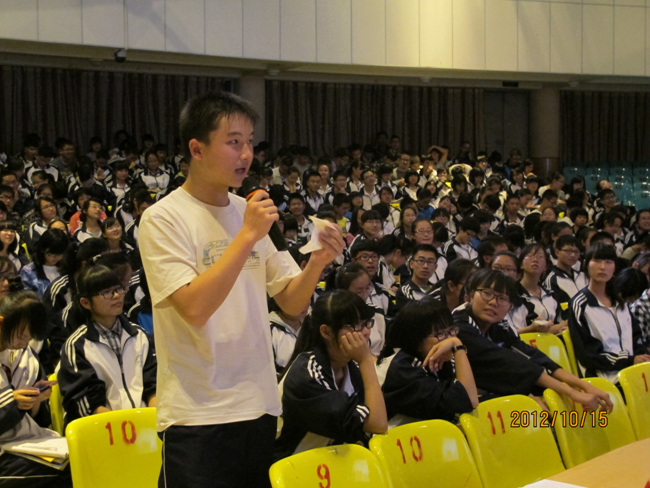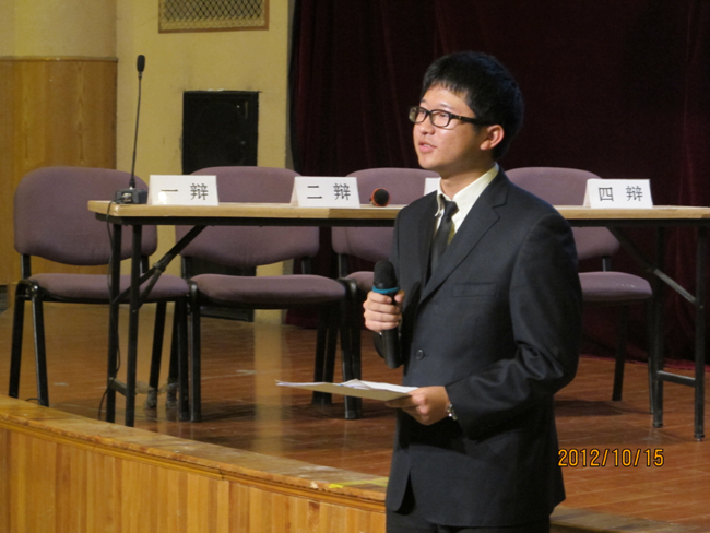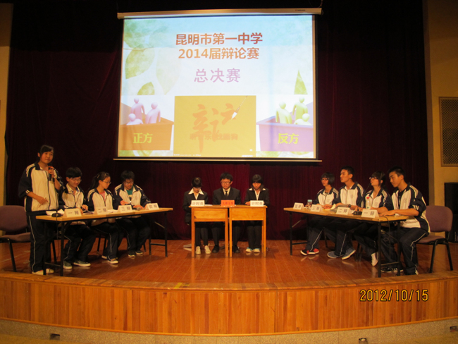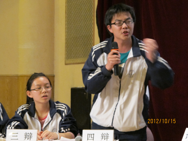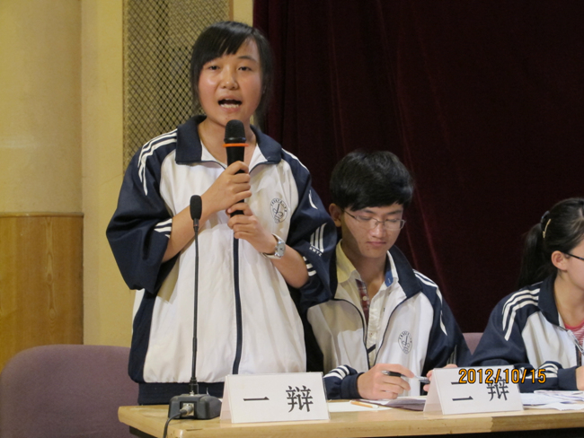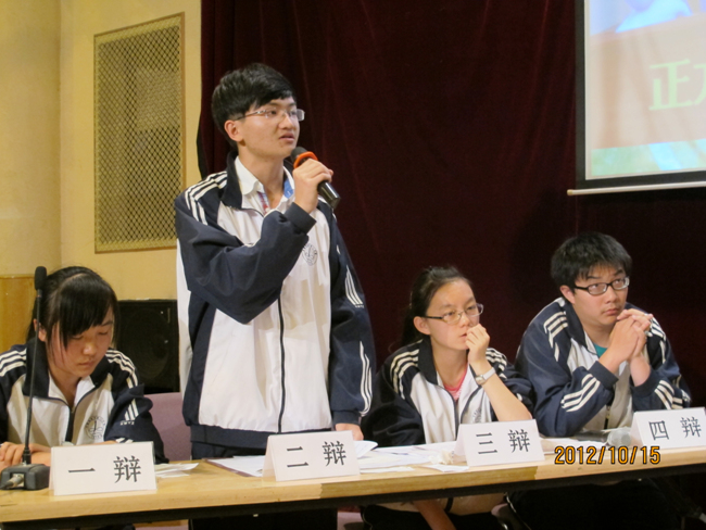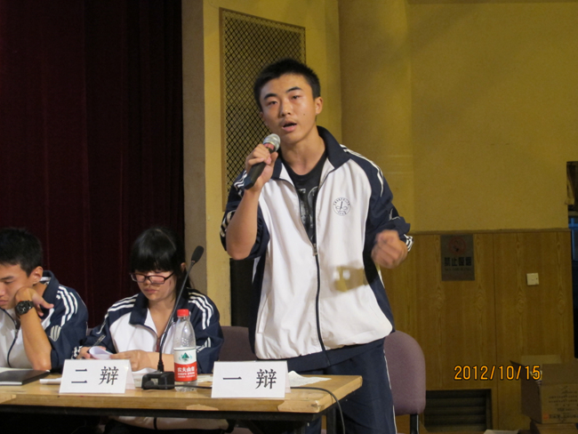 2012年10月15日晚7点,高2014届辩论赛决赛在报告厅揭开战幕。自9月4日初赛以来,前后历时一个月,17个班级经过初赛、复赛、半决赛的激烈角逐,最终文科(1)班和理科(3)班会师决赛。围绕“知足常乐”和“不知足常乐”,双方辩手你来我往,展开攻讦辩难,最终文科(1)班略胜一筹,摘取本场辩论赛桂冠,理科(3)班李智同学发挥稳健,荣膺本场比赛最佳辩手。真理越辩越明,本场辩论赛虽然“交锋”和“厮杀”不足,时有“混战”发生,但双方辩手无疑为现场同学如何审视和看待“知足常乐”和“不知足常乐”提供了新的视角,引发了我们思考,知足与不知足当前,积极调整自己的心态,进止有度,保持人生的常乐。
