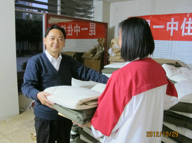 2012年10月29日18:30,学校女生公寓一楼大厅,堆满了棉被,一盒盒保暖内衣整齐地堆放在柱子旁。老师、学生有说有笑,气氛融洽。这是昆一中一年一度举行的为贫困学子发放御冬物品。经过生活老师的认真调查了解,学生工作处审核,来自2015届的82位家庭经济贫困的同学,领到了一床被子、一床褥子、一套保暖内衣。同学们纷纷感谢学校对他们的关怀。