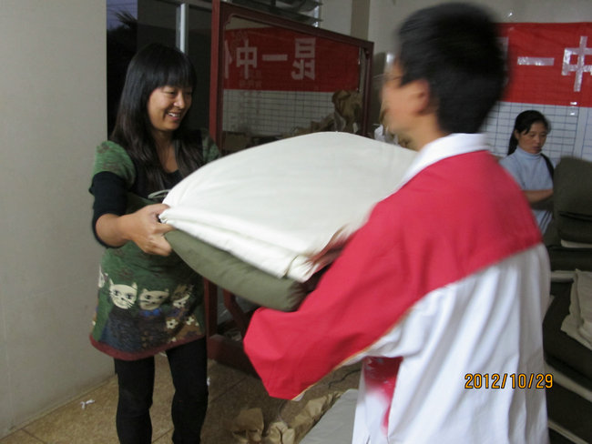 生活老师和丽松为同学发放棉被