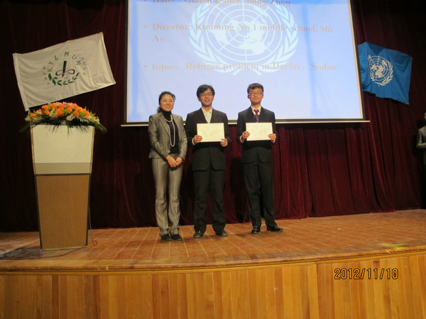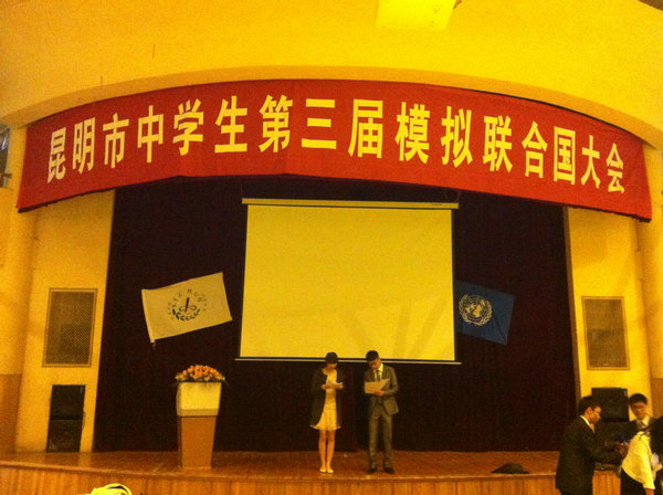 2012年11月10日至11日,第三届昆明市中学生模拟联合国大会在我校召开。分别来自昆一中、师大附中、昆三中、昆八中、昆十中、滇池中学、外国语学校七所学校的200多名同学集聚一堂,同学们个个身着黑色西服,手拿公文包,精神抖擞的参与本次盛会,在为期两天的大会中,各国代表围绕国际上的热点问题召开会议,共同商讨了关于“非洲优先”、“苏丹问题”、“苏丹人权问题”、“Refugee Problem in darfur . sudan”等四个问题,同学们分别扮演不同国家的外交官,作为各国代表积极的参与到“联合国会议”当中。各校代表们通过精彩的辩论、游说和演讲,竭力阐述“自己国家”的观点和维护“自己国家”的利益,整个大会获得了圆满的成功,并祝贺同学们在今后的“联合国”的舞台上,充分发挥自己的才能。