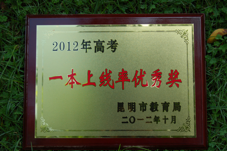 年高考质量优秀和进步学校表彰奖励总结大会”。我校2012年高考升学成绩622分以上共计31人,文理一本综合上线率达到83.48%的新高,成绩突出,会上荣获昆明市教育局颁发的“2012年高考一本上线率优秀奖”。