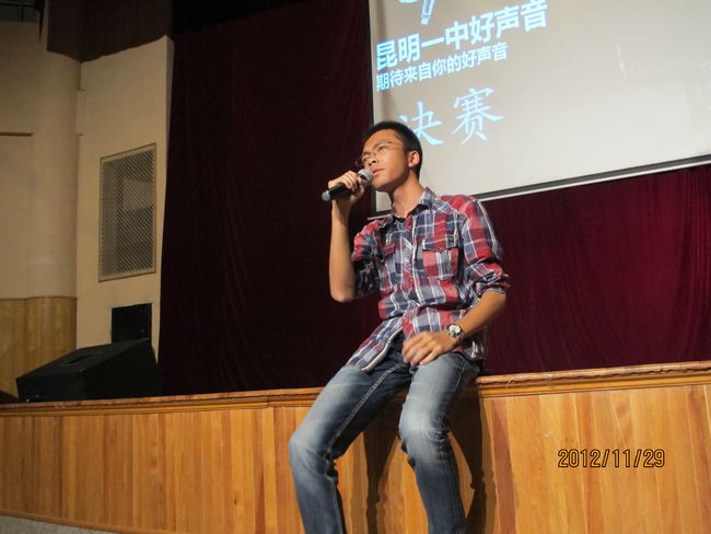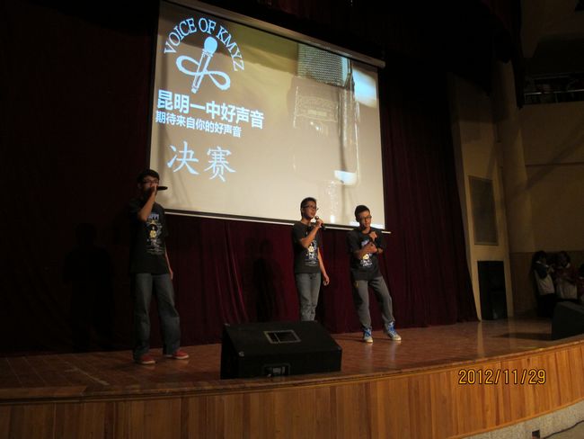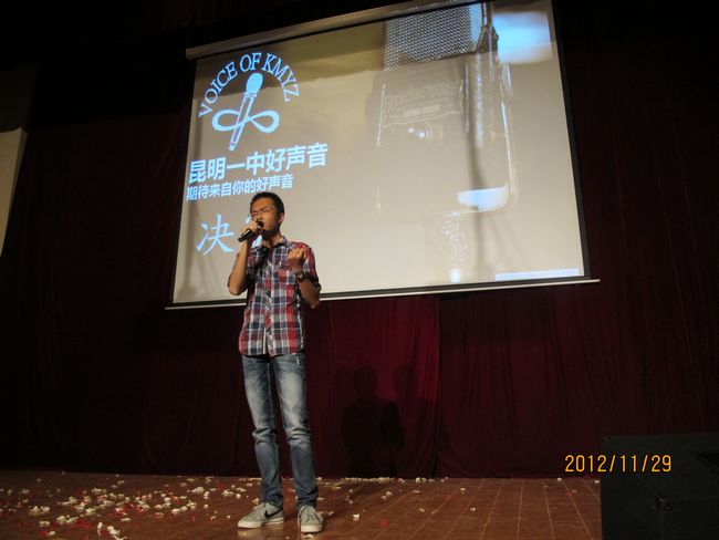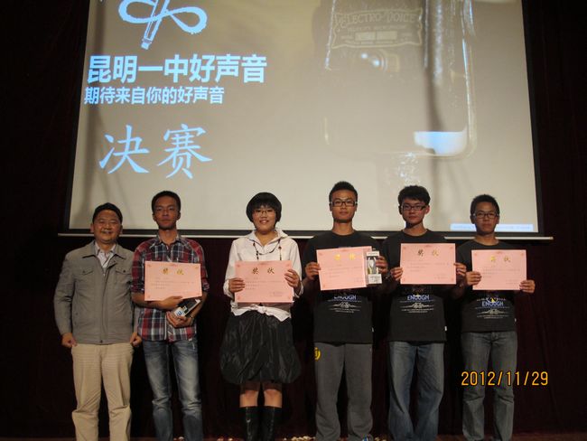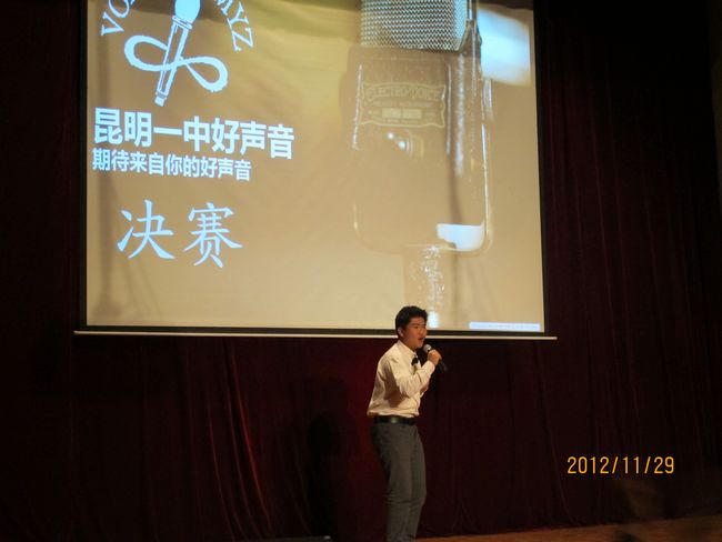 2012年11月29日晚19:30,昆一中报告厅挤满了近千学生,座无虚席。同学们翘首以待,那些隐伏在我们身边的好声音即将破空而出。经过海选和复赛,10余名实力唱将跻身决赛,分成的三支唱队分别由昆一中艺术组石老师、云南省艺术学院硕士卢老师和罗老师领衔。一曲歌罢,再致深情,梦回经典,流行前线,无一不撩人心肠,款款动人。经过大众评委、专家评委和导师现场投票,三轮激烈的比拼过后,最终高二理(9)班杨玄琳荣获冠军及最佳人气奖;高一(8)班罗婕、高二(8)班Heart beat组合、高一(12)班李彦筠荣获二等奖;高一(3)班李剑虹、高一(8)班吴卓芮、高一(18)班徐郡藜、NCC龙禹廷、高一(4)班潘姝蓉、高二文(2)班吴壤西、高一(16)班Beyond Inspiration组合、高一(18)班代数年华组合荣获三等奖;龙禹廷和罗婕还同时荣获了最佳舞台表现奖。一场好声音的饕餮盛宴,歌声已过,报告厅仿佛余音犹在。