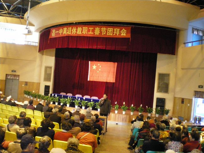 ,学校报告厅迎来了一群白发苍苍的老人,有的甚至拄杖而来。昆一中离退休教职工新春团拜会正在这里举行,这也是近期工会的系列活动之一。老教师们借着这个机会重新聚到了一起,在新年到来之际,学校为离退休教职工送上了温馨的祝愿,学校领导还为