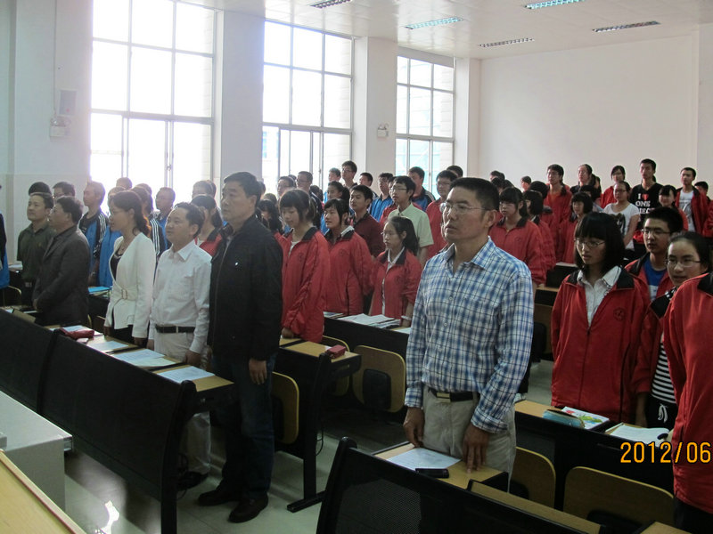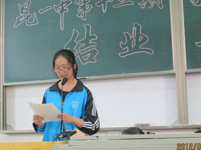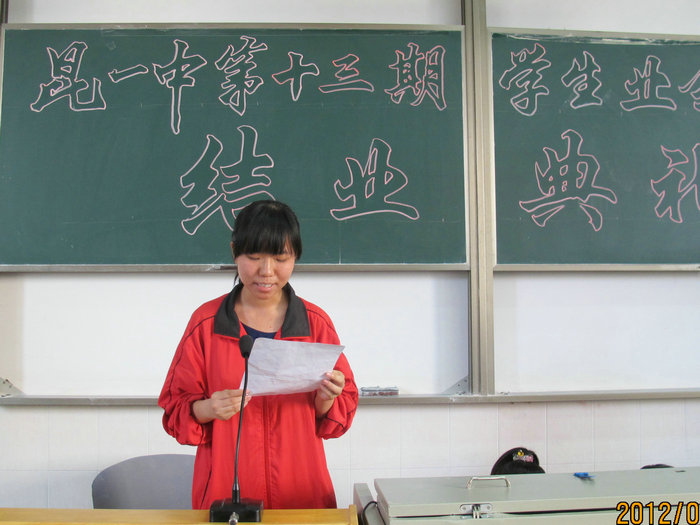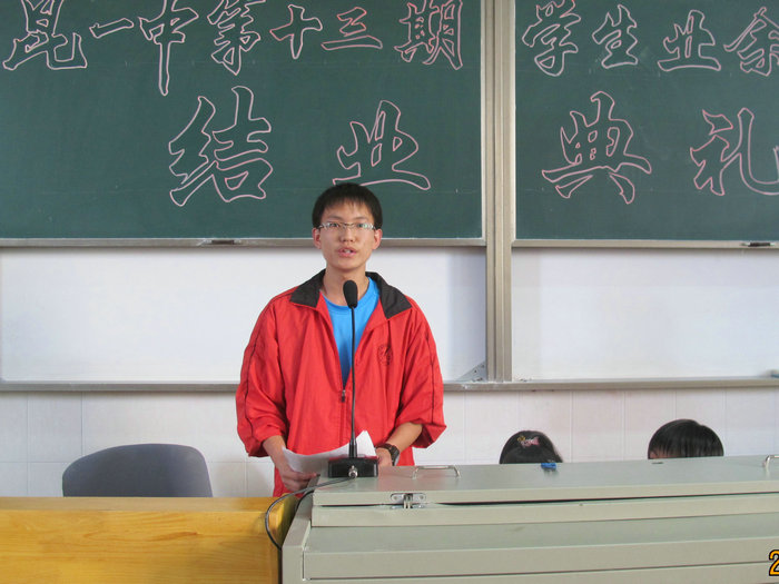 2012年6月4日下午5点,学校3号楼多媒体3教室座无虚席,国歌响起,学校正在进行第十三期业余党校结业典礼。出席结业典礼的有中共昆一中委员会书记王泉老师,党委委员、校长赵灿东老师,党委副书记高富英老师,党委委员、校长助理李品江老师,党委委员、党政办主任杜德祥老师,学生工作处主任孙碧桧老师;2012届党支部宣传委员、学生工作处副主任杨杰文老师,学生工作处副主任、团委书记陈永裕老师,团委干事牟洁老师。王泉书记和赵灿东校长先后发言,希望同学们信仰在心,不断前进。随后,同学代表依次上台发言,并观看了专题励志片《天堂的忏悔》。最后,本次结业典礼在庄严的国际歌中圆满完成。在座的146名同学通过为期两个多月的学习,认识了党的光辉历史,学习了党的优良传统与作风,树立了共产主义信仰等,以实际行动向党组织靠拢,完成了系列学习,获得了结业证书。