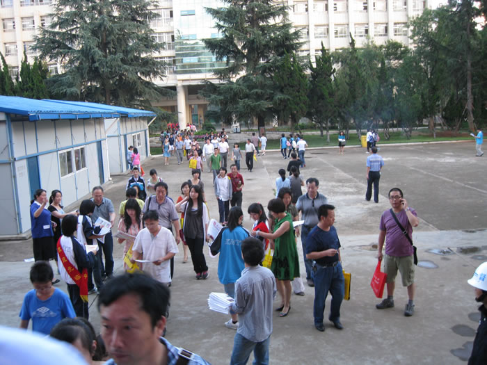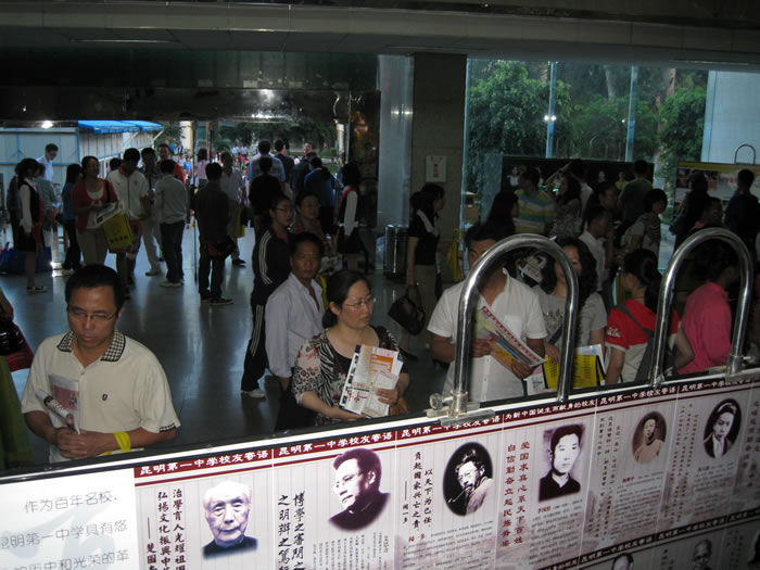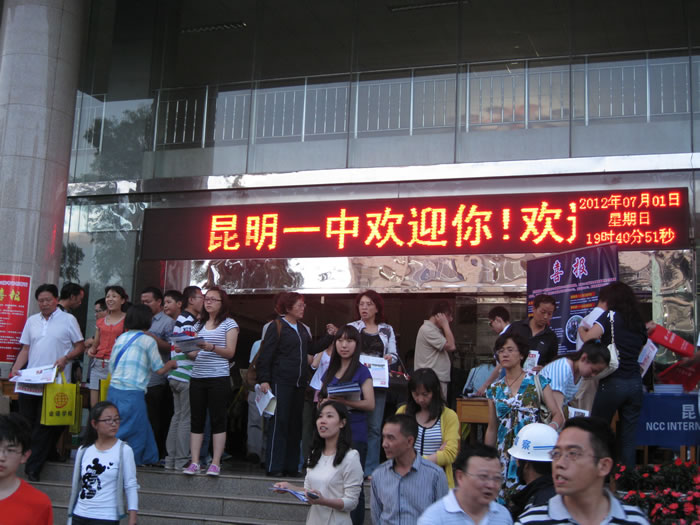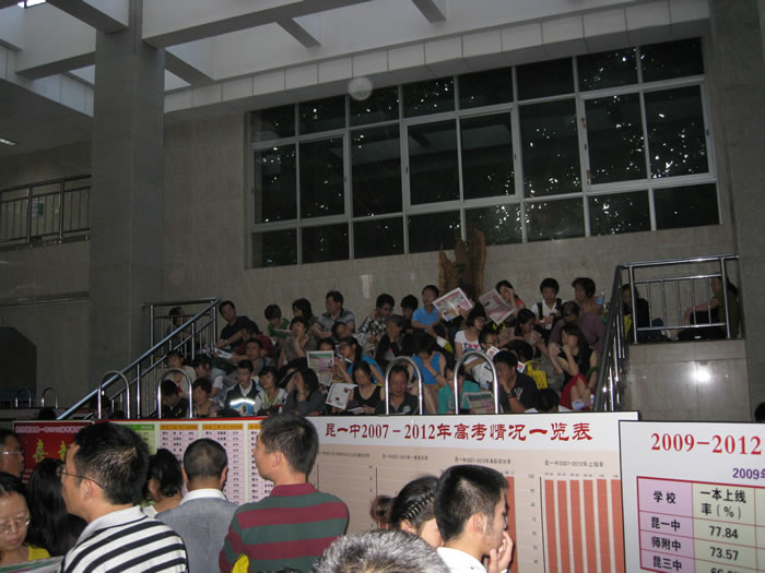 2012年7月1日昆明一中高中招生咨询会在科技楼举行。晚上7点半赵灿东校长宣布咨询会开始,赵校长就昆一中的办学理念、人才培养模式、今年的高考成绩、昆一中历史、办学条件等向参会人员作了报告,赵校长等多位学校领导认真回答了家长、学生的提问。咨询会在主会场科技楼报告厅和两个分会场多媒体教室1、2举行,人山人海,科技楼大厅占满了前来咨询的家长、考生,连楼梯和走道两边都坐满了人。一位来自云大附中中考估分845的考生,在父母的陪同下来到了咨询会现场,其父亲坦言:各个顶级重点高中都有新的办学理念,只不过昆一中的领导和老师更重视用行动来证明。他准备让孩子选择昆一中。
