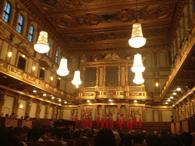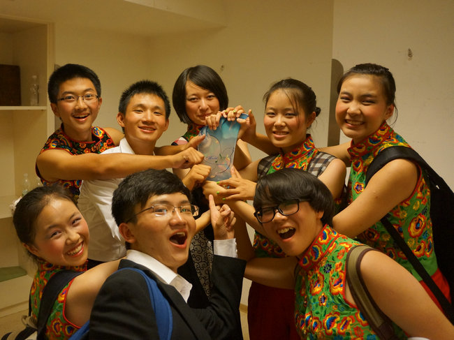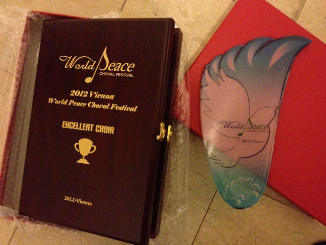 在来自世界各地30个国家的合唱队中,我校合唱队的同学于8月2日晩在世界音乐殿堂金色大厅以出色的表现,获得了维也纳童声合唱团总监维尔特先生的高度赞赏,我校合唱团被大会组委会授予合唱节举办以来的最高奖项“金色和平奖及奖杯”(唯一一个最高奖项)。