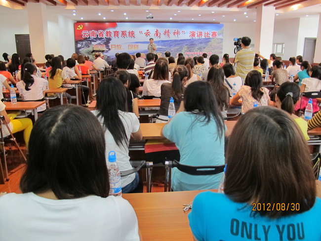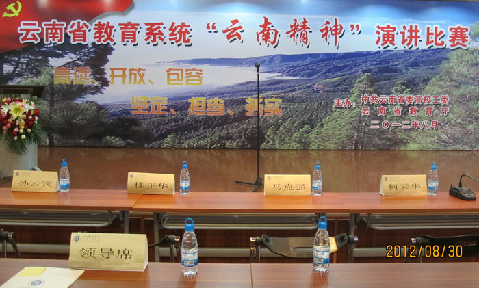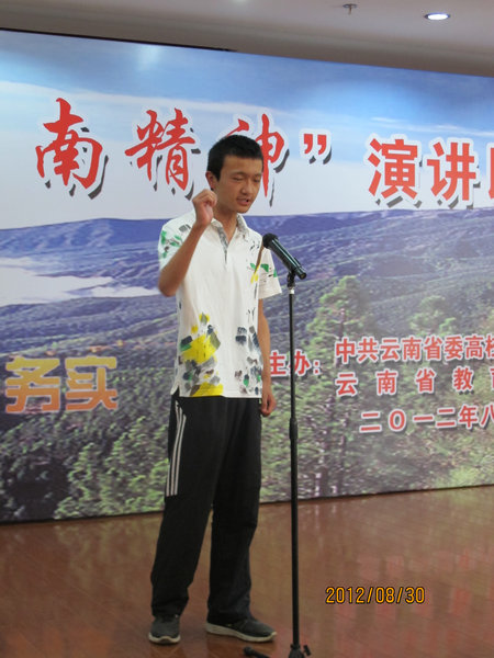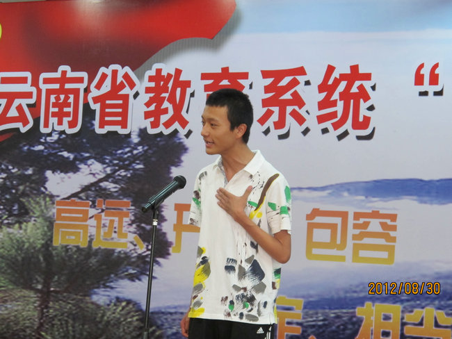 2012年8月30日,云南省教育系统“云南精神”演讲比赛在省教育厅隆重举行,全省各大中专院校、中小学经过预赛选拔出的28位师生参加比赛。我校高2013届理5班的和艺峰同学高亢激昂、声情并茂的演讲打动了观众、征服了评委,获得一等奖(共3人)。我校高效务实的组织工作也得到了肯定,获得组织奖(共10个)。