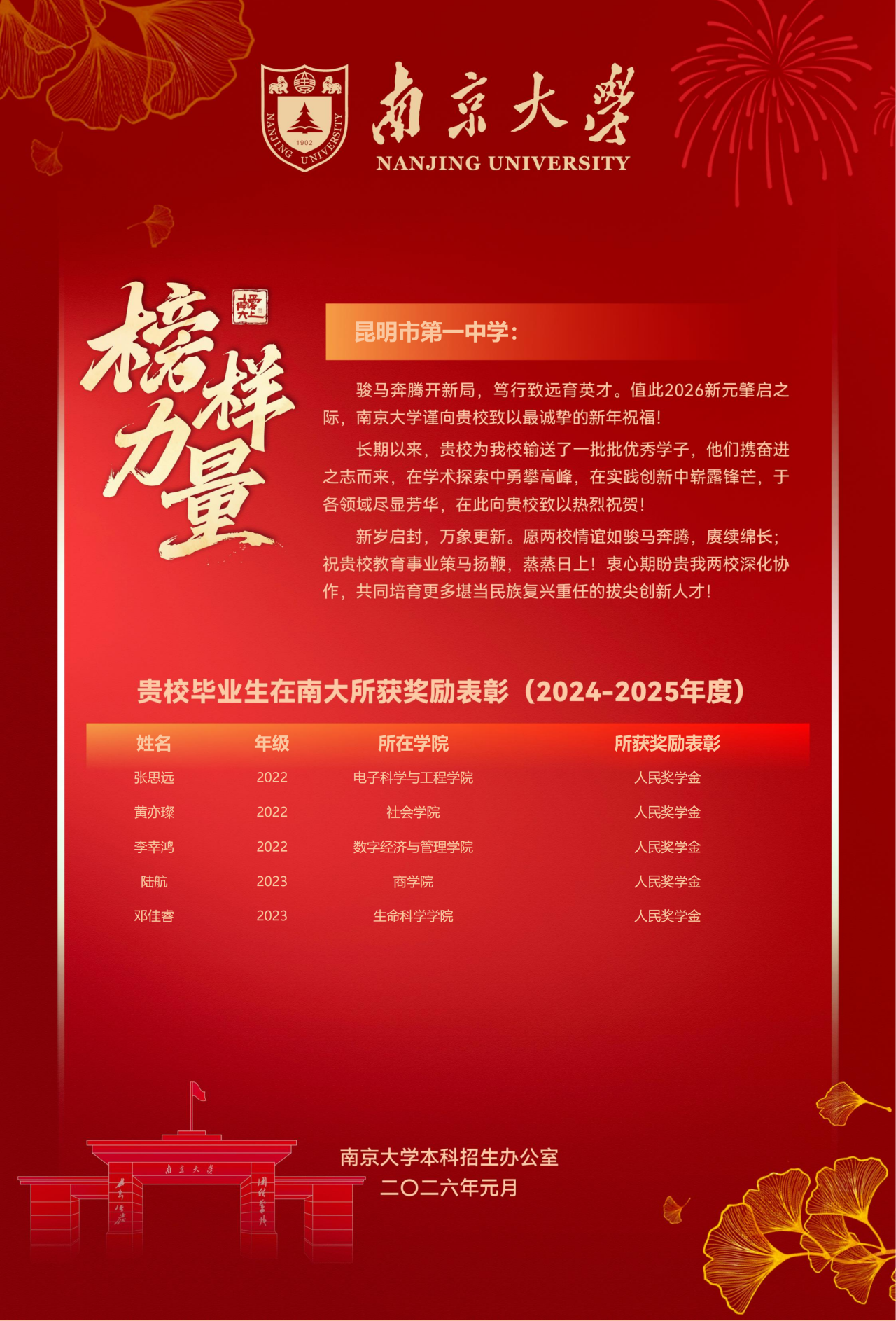 南京大学在喜报中指出,昆一中毕业生携奋进之志来到南大,在学术探索中勇攀高峰,在实践创新中崭露锋芒,于各领域尽显芳华,体现了中学阶段系统培养与大学拔尖人才培养的良好衔接。