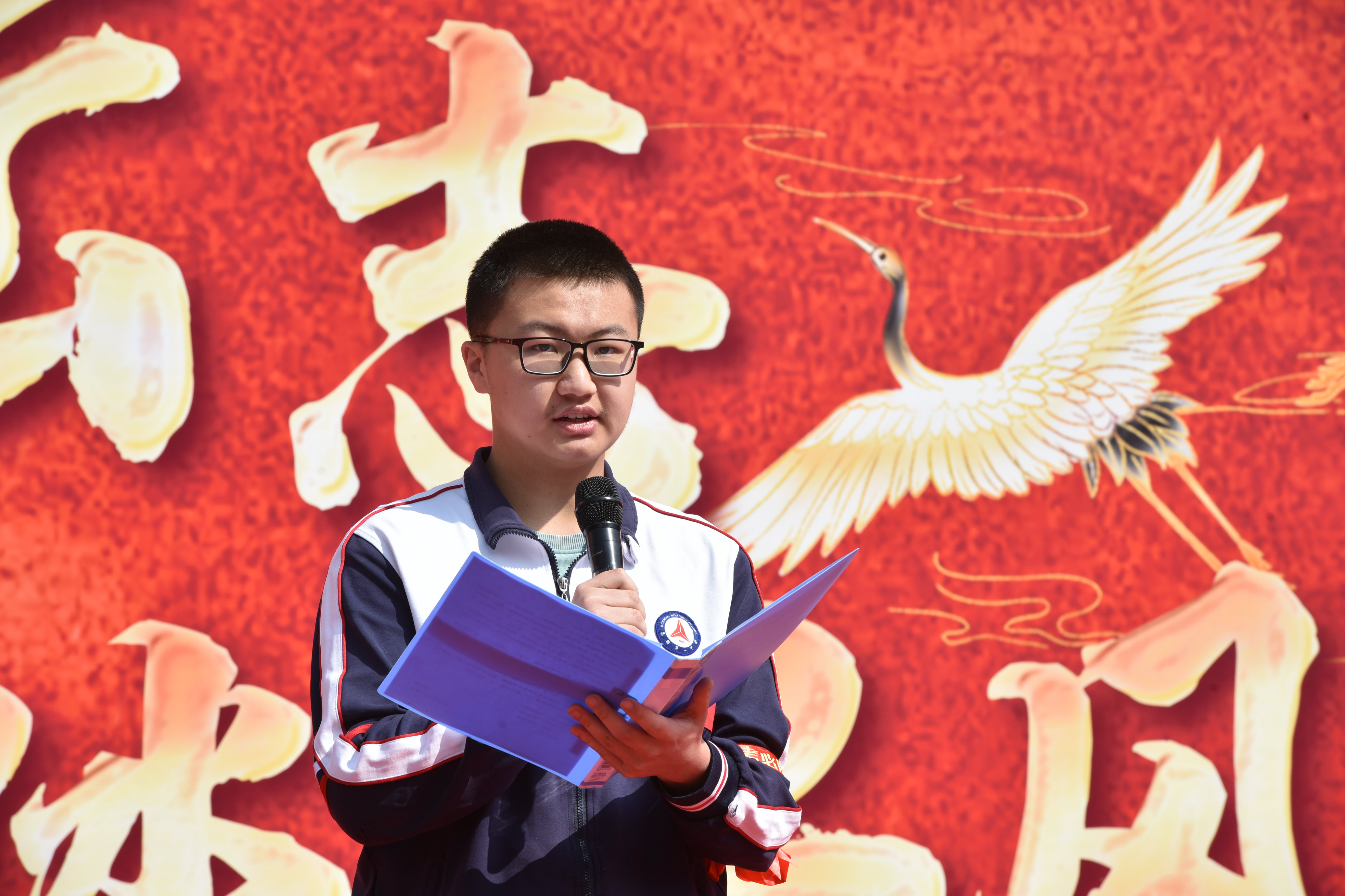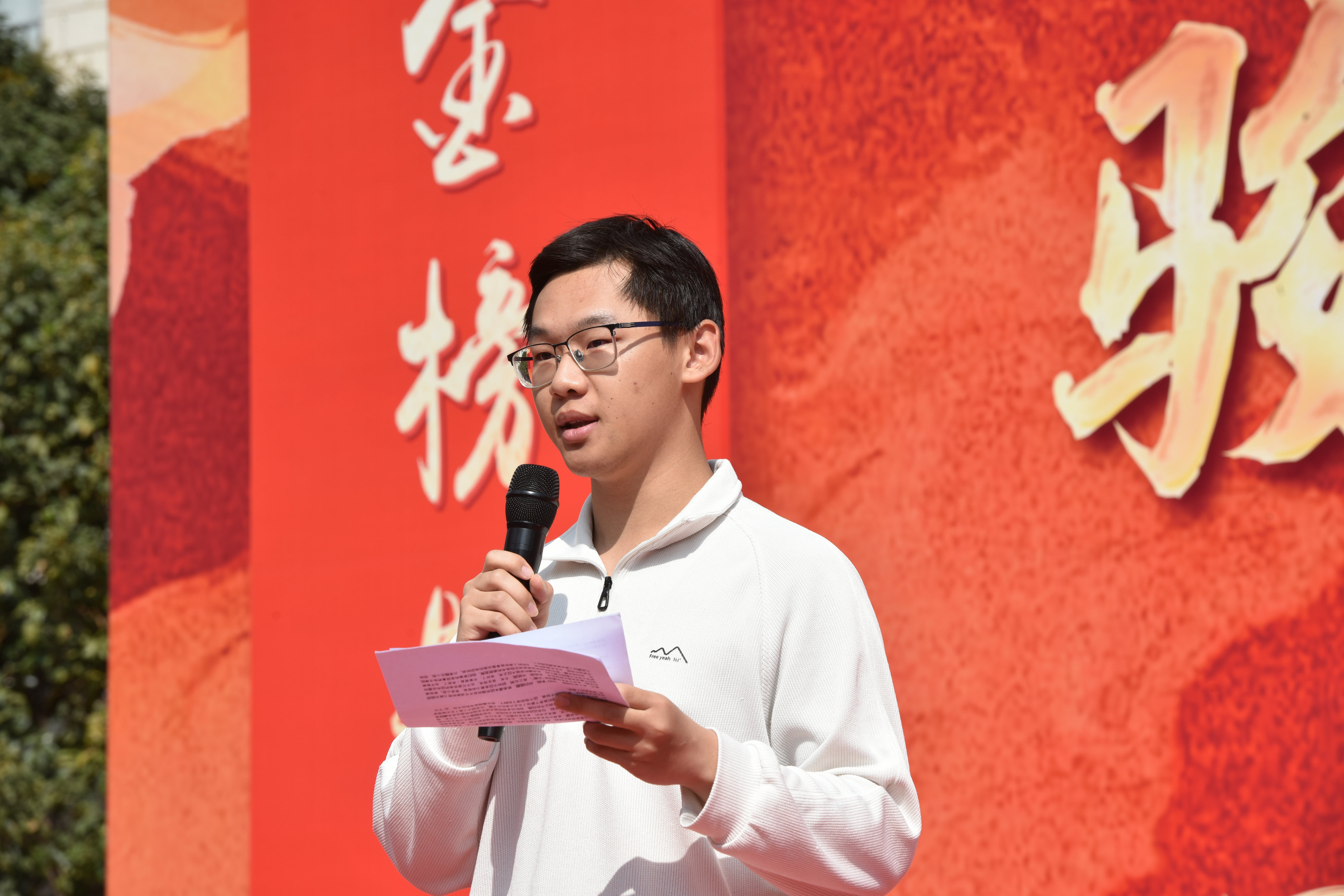 学生代表周子轩上台发言,分享备考心得与青春理想:“真正决定我们走多远的,不是道路是否平坦,而是内心是否坚定。”他劝勉全体同学全力以赴,用汗水浇灌希望,用坚持赢得胜利。独行快,众行远,同学们在最后的一百天里团结一心、奋勇争先,终能循此苦旅,以抵群星。