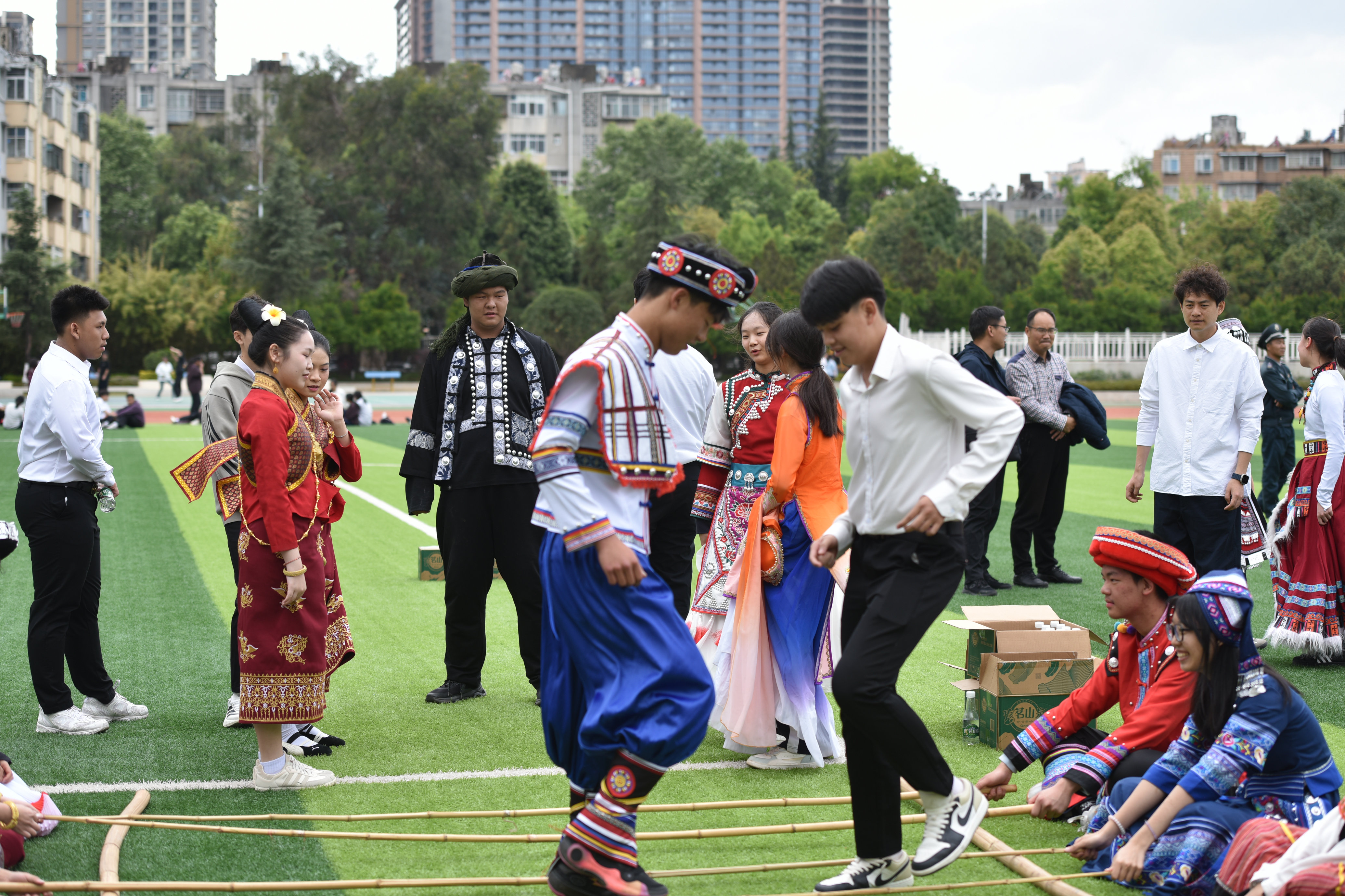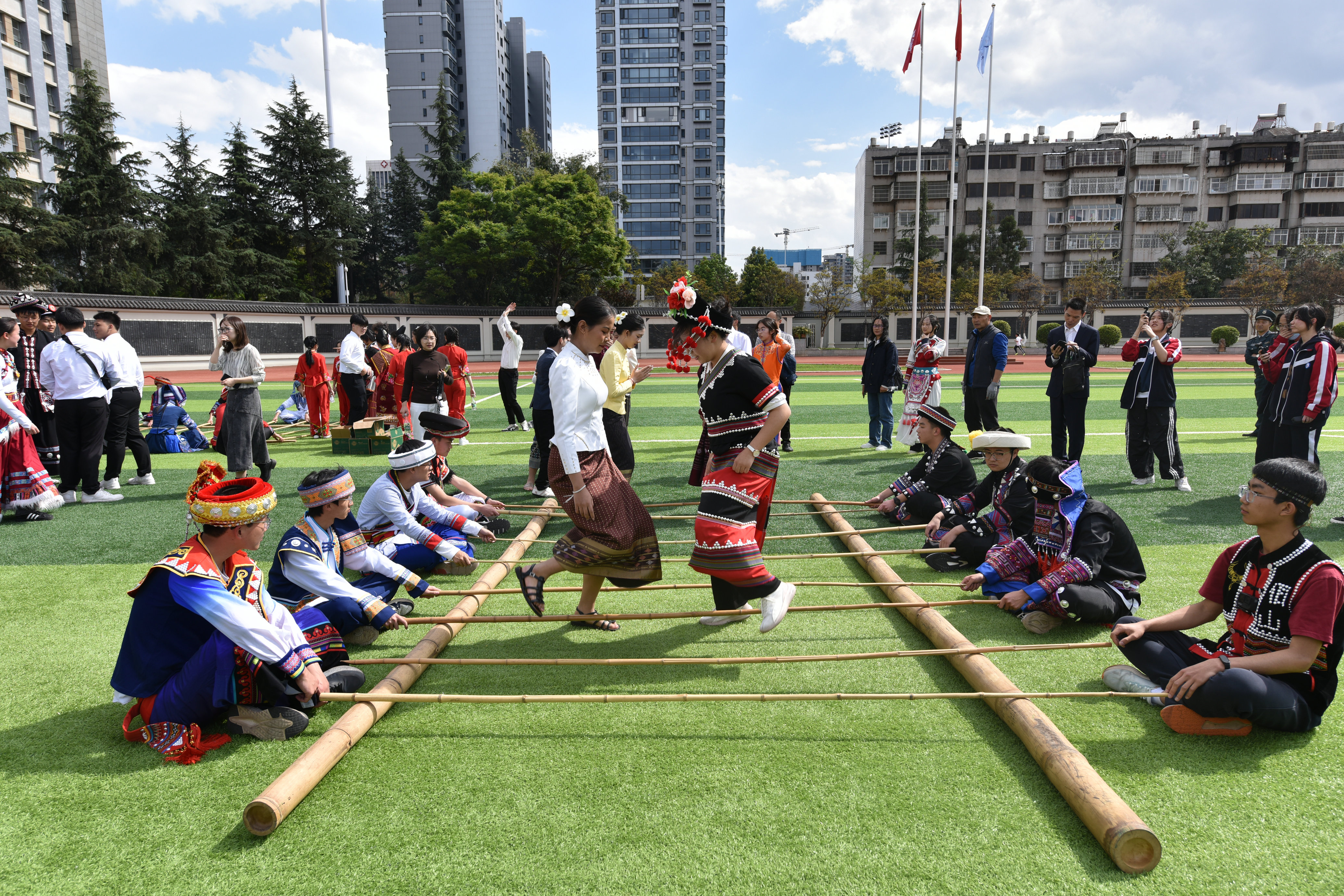 在学校足球场上,一场充满欢乐的团建交流活动如期开展,成为中老青年深化友谊的重要纽带。昆一中同学身着各民族传统服饰,以最饱满的热情迎接远道而来的老挝朋友,将云南多民族的淳朴好客展现得淋漓尽致。极具云南特色的竹竿舞率先点燃现场气氛,清脆的竹竿敲击声与悠扬的民族音乐交织,中老两国学生手拉手、心连心,相互配合、彼此学习,即便语言不通,灿烂的笑容也成为跨越国界的最好沟通,每一个舞步都传递着青春的喜悦与友谊的温情。随后开展的“鼓聚友谊、青春共鸣”同心鼓颠球活动中,双方学子齐心协力、默契配合,在一次次尝试、一次次协作中,打破隔阂、增进理解、建立信任,将“友谊第一”的理念融入每一个互动瞬间。