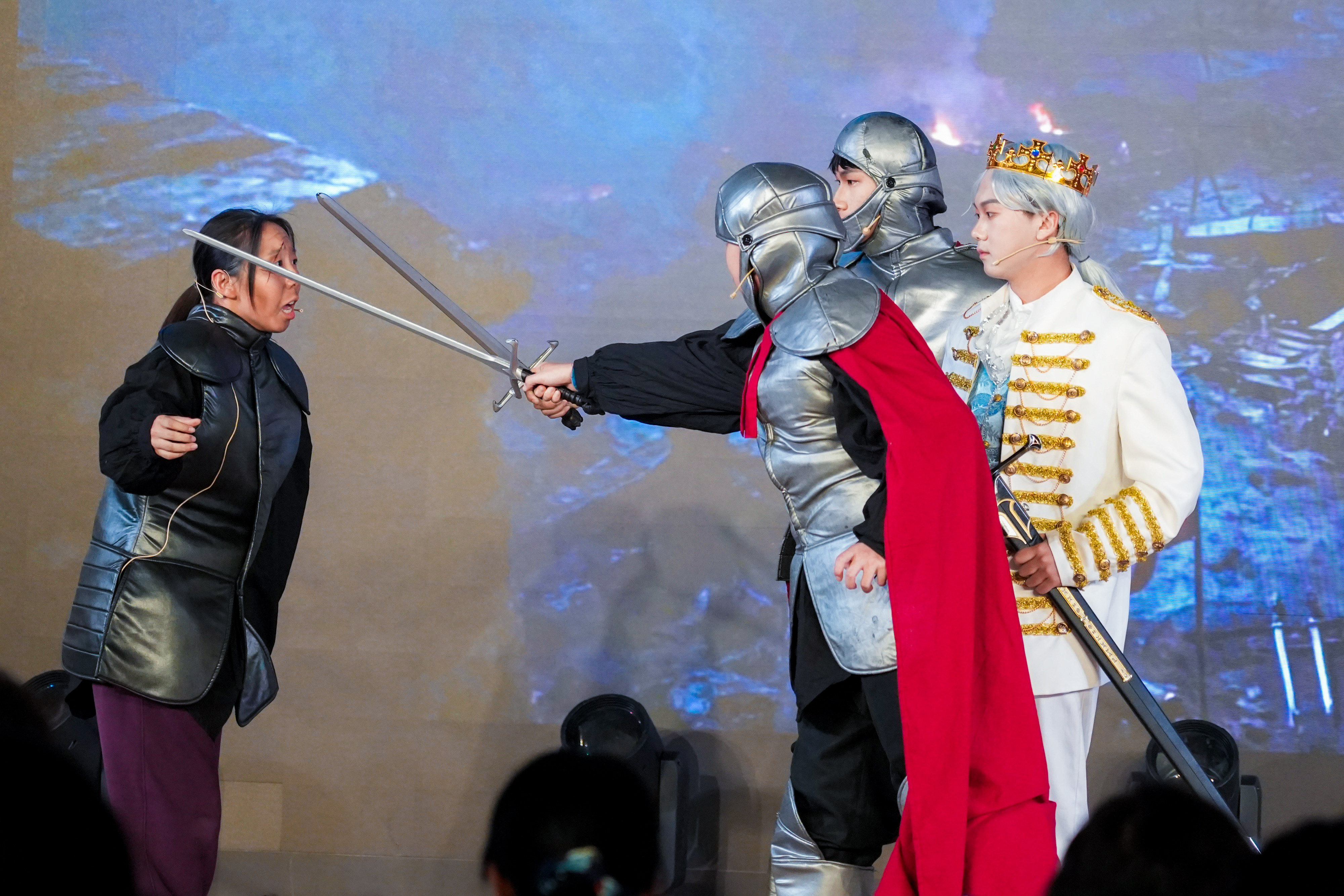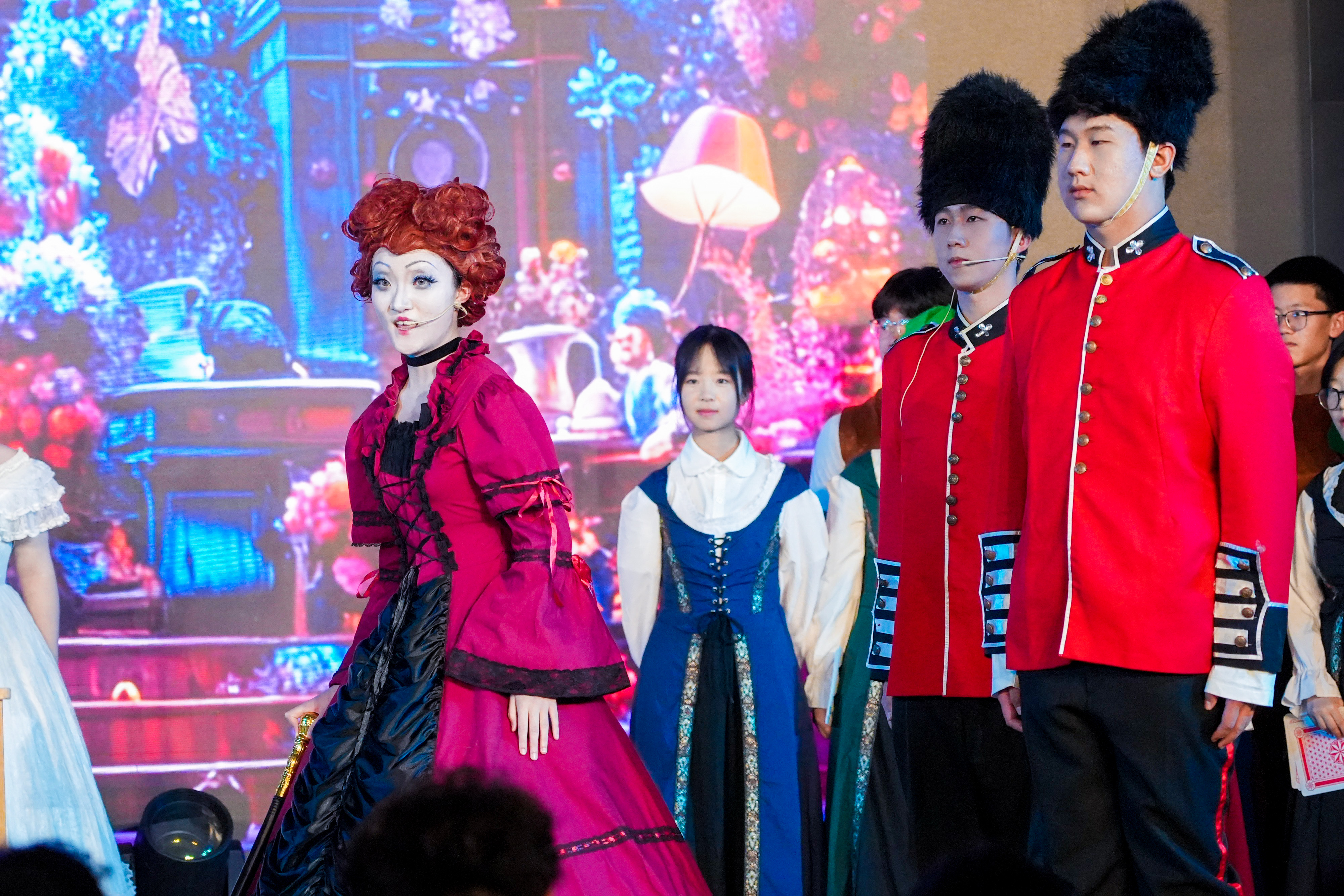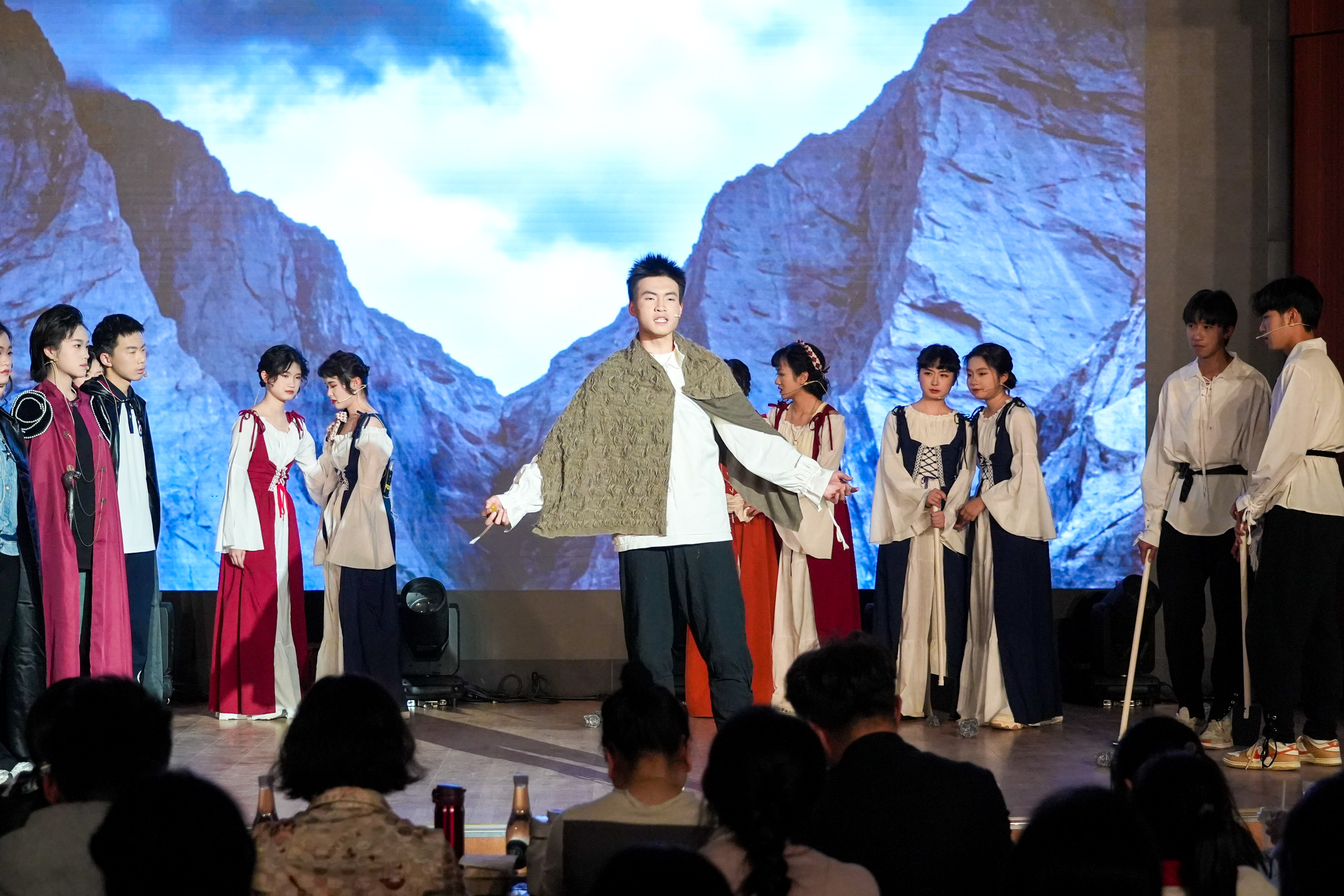 洞窥本质,已见真理。高二(14)班用一场荒诞的审判重现了尘封的历史,更将真理不畏权威的信念化作一场直击灵魂的戏剧独白。东南有佳木,向阳长新枝。高二(16)班的同学化作旧土里萌发的新生。舞台之上,每一寸伸展都在诉说:成长,是向着光的方向。作业成山的那晚,“爱丽丝”梦见自己跌进了兔子洞,高二(12)班的同学化成猫,鸟,列队前行的扑克。在红皇后的追捕下,“爱丽丝”找到对抗压力的勇气。国王克努特征战四方,啸向大海。却始终无法找到幸福的踪迹,直到高二(13)班的同学用北英格兰的雪花莲种下一片幸福的花田。笙歌彻夜,面具之下暗藏杀机;觥筹交错,笑语之间剑影刀光。高二(15)班的同学们将这场华美而阴郁的宫廷夜宴搬上舞台,演绎了一场关于欲望、权力与背叛的悲剧。沉默不是屈服,是无言的坚守;荣耀不在喧哗,在寂静中生根。高二(3)班的同学们讲述了一段关于信念与尊严的故事。当世界喧嚣,总有人在静默中扛起属于自己的荣光。一本练习册,穿越时空的鸿沟;一双手,递向知识荒原里的尤利娅。高二(5)班的同学们固执地点亮火种。穿越而来的练习册,不只是题目,是希望,是一个时代对另一个时代的馈赠。巴黎的夜幕下,街垒升起,热血洒落。高二(6)班的同学们用激昂的群戏,再现了那个理想与鲜血交织的夜晚。枪声、呐喊、倒下又站起的身影——自由的光芒,从未在黑暗中熄灭。