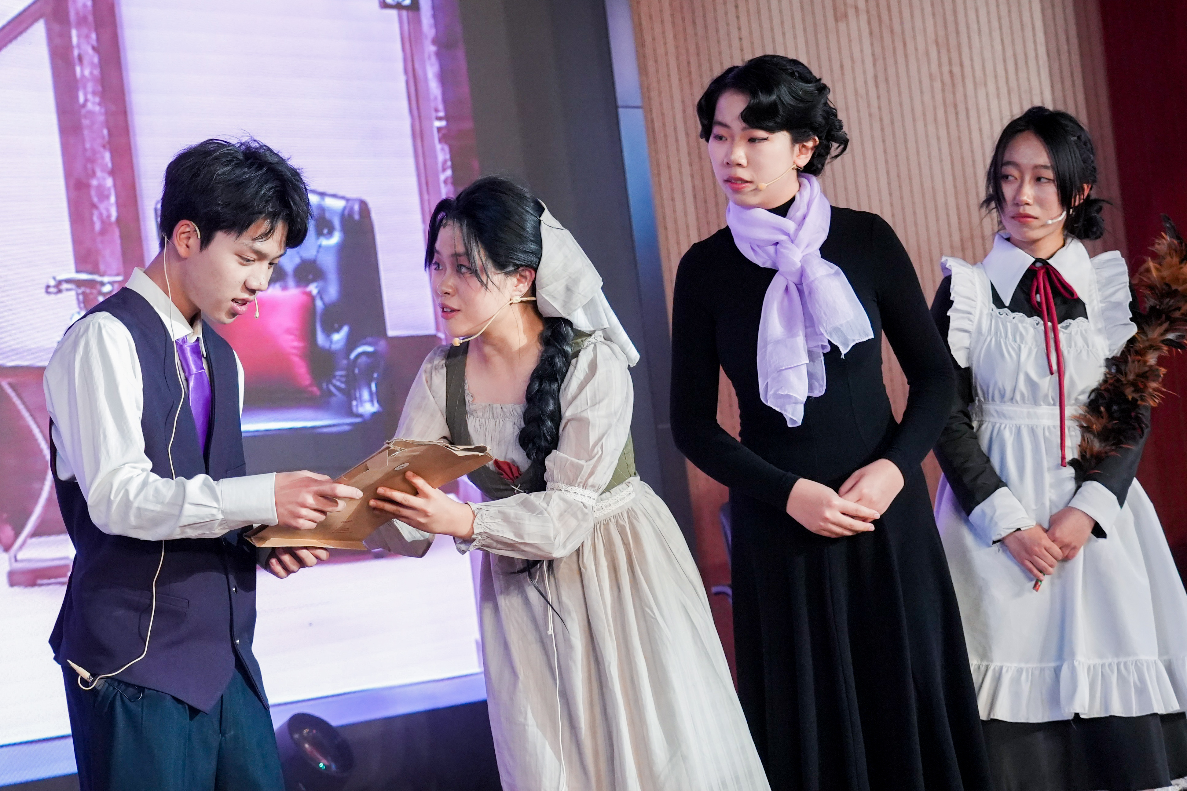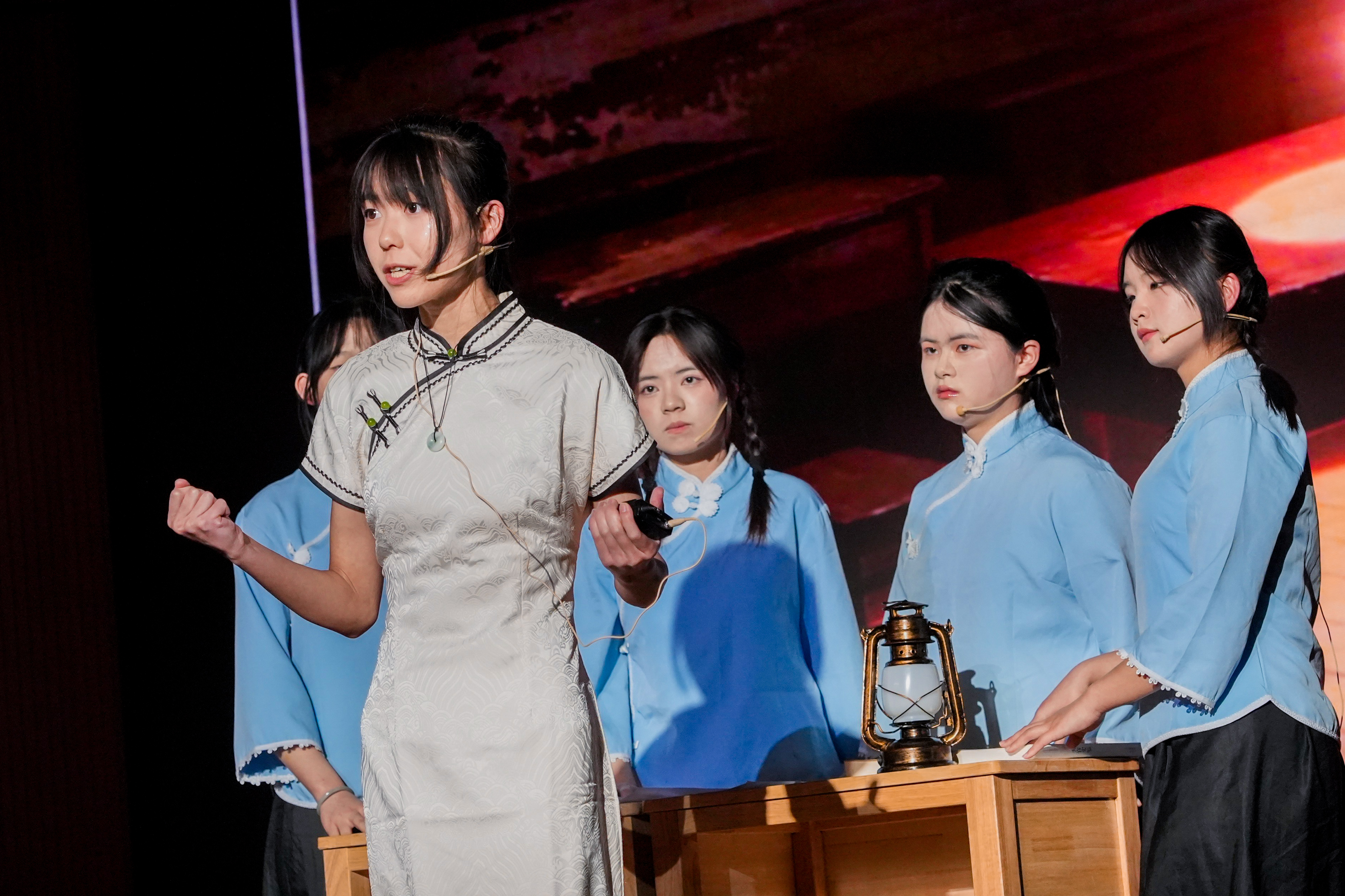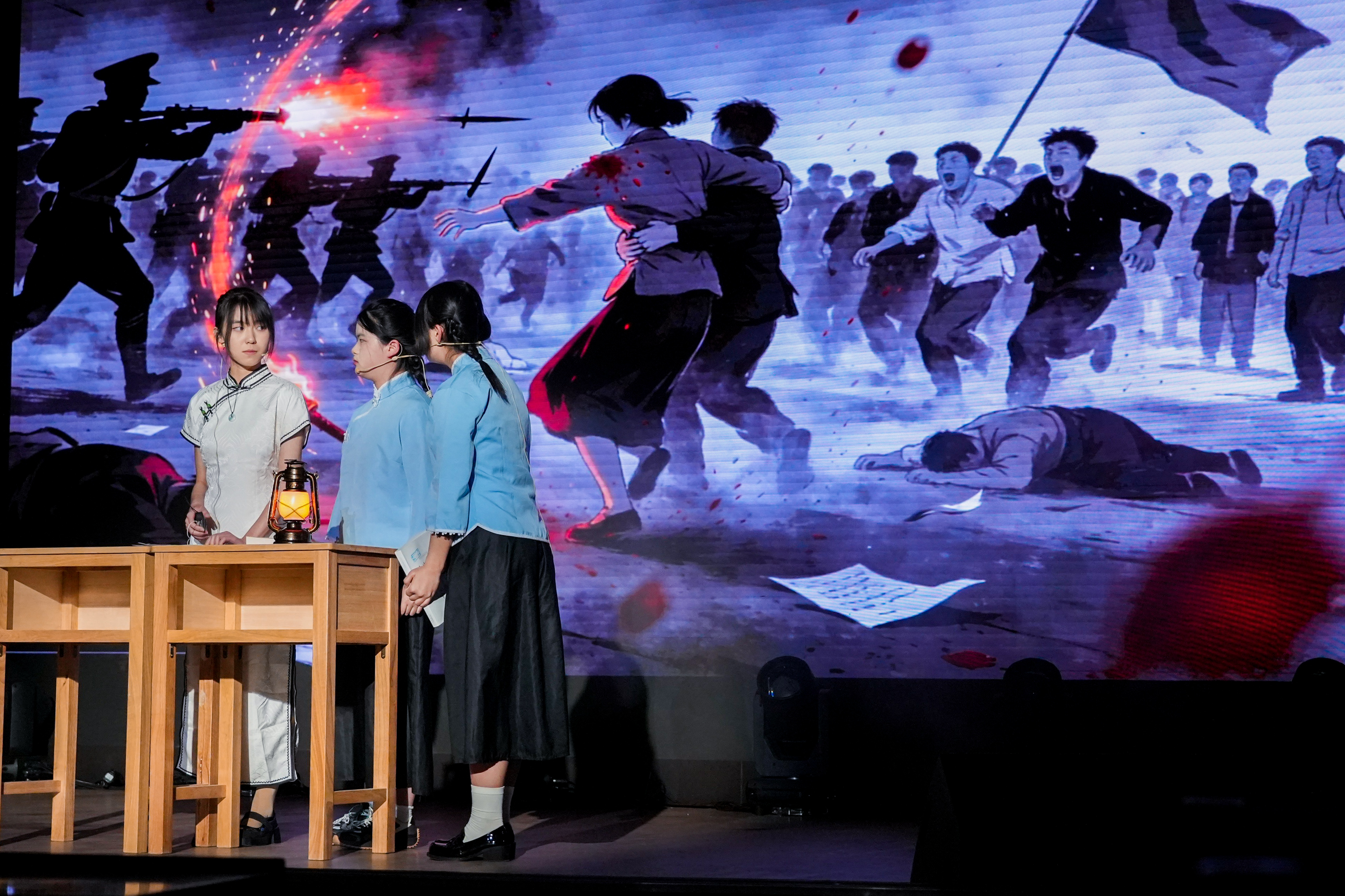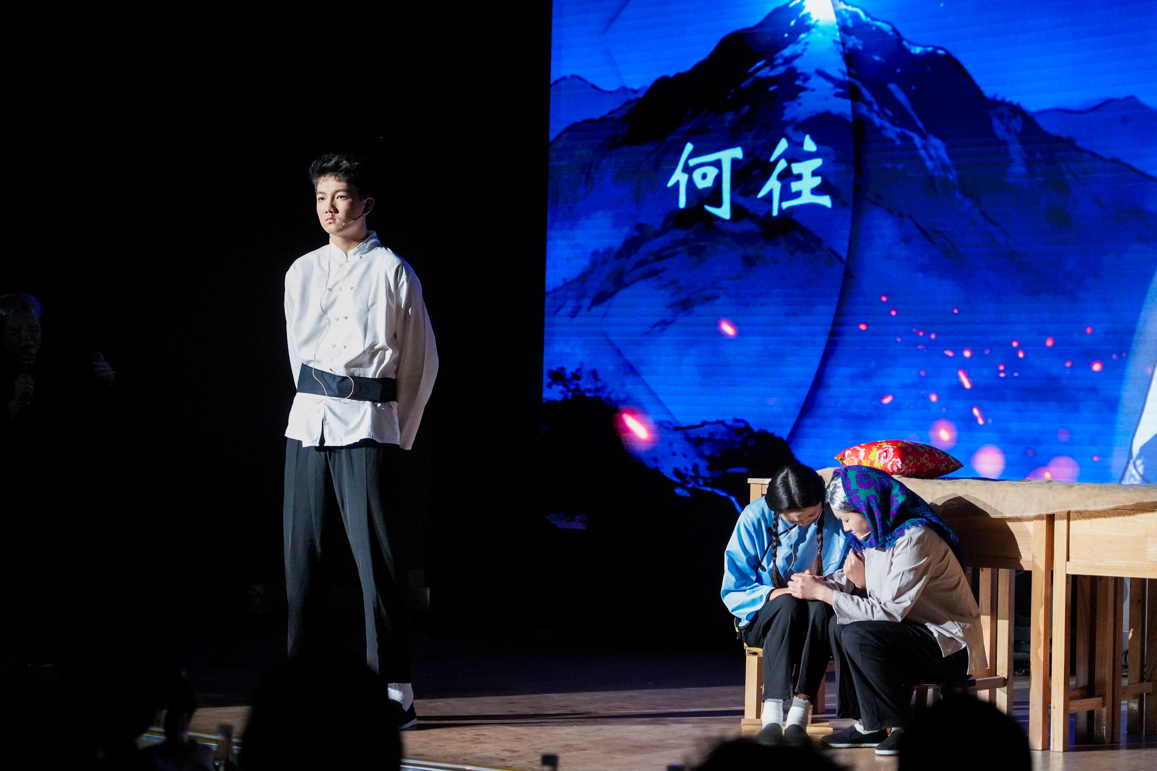 真的猛士,敢于直面惨淡的人生,敢于正视淋漓的鲜血。高二学贯的同学们将鲁迅笔下的文字,化作舞台上沉痛而有力的呐喊。刘和珍君的身影,在枪声中倒下,却在民族的记忆里永生。“都是为你好”——这句话,是爱,还是枷锁?高二(7)班的同学们用一出心理剧,让父母与孩子在舞台上坦诚相对。那些未曾说出口的委屈,那些被误解的深情,在灯光下交汇、和解。长老说山神怒目,不可逾越。高二(9)班的同学们追随先行者的脚步走出山谷,探索未知。发现原来山谷困住的不是脚步而是目光。烽火燃尽古城,屠刀悄然举起。民族危亡之际,一群热血少年挺身而出。高二(2)班的同学用真相叩响世界,只为守护同胞、铭记国殇。暗无天日的角落,女工的苦难,在舞台上被一寸寸剖开——是鞭痕,是压榨,是旧时代吃人的沉默。可高二(1)班的同学们不曾低头。当压迫到达极限,那双早已伤痕累累的手,终于握成了拳。冬夜,高二(18)班的学生为改成绩向老师索要钥匙。温情背后,是一场道德与功利的博弈。这场演出叩问着每个教育者与受教育者:有些底线,永远不能逾越。朱门深锁,夜未央。华灯之下,是暗流涌动的困局;锦绣之中,是身不由己的命运。四班的同学们演绎了一场关于选择与代价的悲歌。浮华背后,是困兽犹斗的灵魂。一对银烛台,照亮了黑暗中迷途的灵魂。高二(17)班将烛光点亮,那个曾经被世界抛弃的人,终于学会了如何爱人。原来,救赎不是审判,而是一束愿意照亮别人的光。黎明前的至暗时刻,有人选择沉默,有人选择逃离,高二(11)班的同学们,选择点燃。一群师生在黑暗中围坐,每一页翻过的纸张,都是对愚昧的抵抗;每一次低声的诵读,都是对光明的呼唤。疏影横斜,暗香浮动;水清浅处,光影徘徊。曾经隔海相望的身影,在围巾、黄葛树下和信间消散。高二(8)班的同学坚信,会再相逢必有期,常怀信念终无憾。