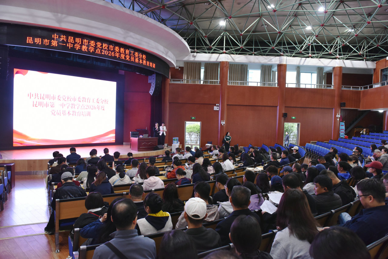 2026 年4月,中共昆明市委党校市委教育工委分校昆明市第一中学教学点2026年度党员基本教育培训在我校科技楼报告厅隆重举行。昆一中、师专附中、教科院、盲哑学校、昆旅职中、市青少年活动中心、市体育中心、市教育发展服务中心、市教工第二幼儿园(昆师路)等九家单位共四百余名党员齐聚一堂,共同参与此次思想“充电”与精神“补钙”。培训由学校党委书记高富英主持,特邀省委党校、市委党校专家学者,围绕党性修养、正确政绩观、教育重要论述、新媒体舆情应对四大核心专题,为全体党员带来了一场高规格、高质量、高实效的理论盛宴。