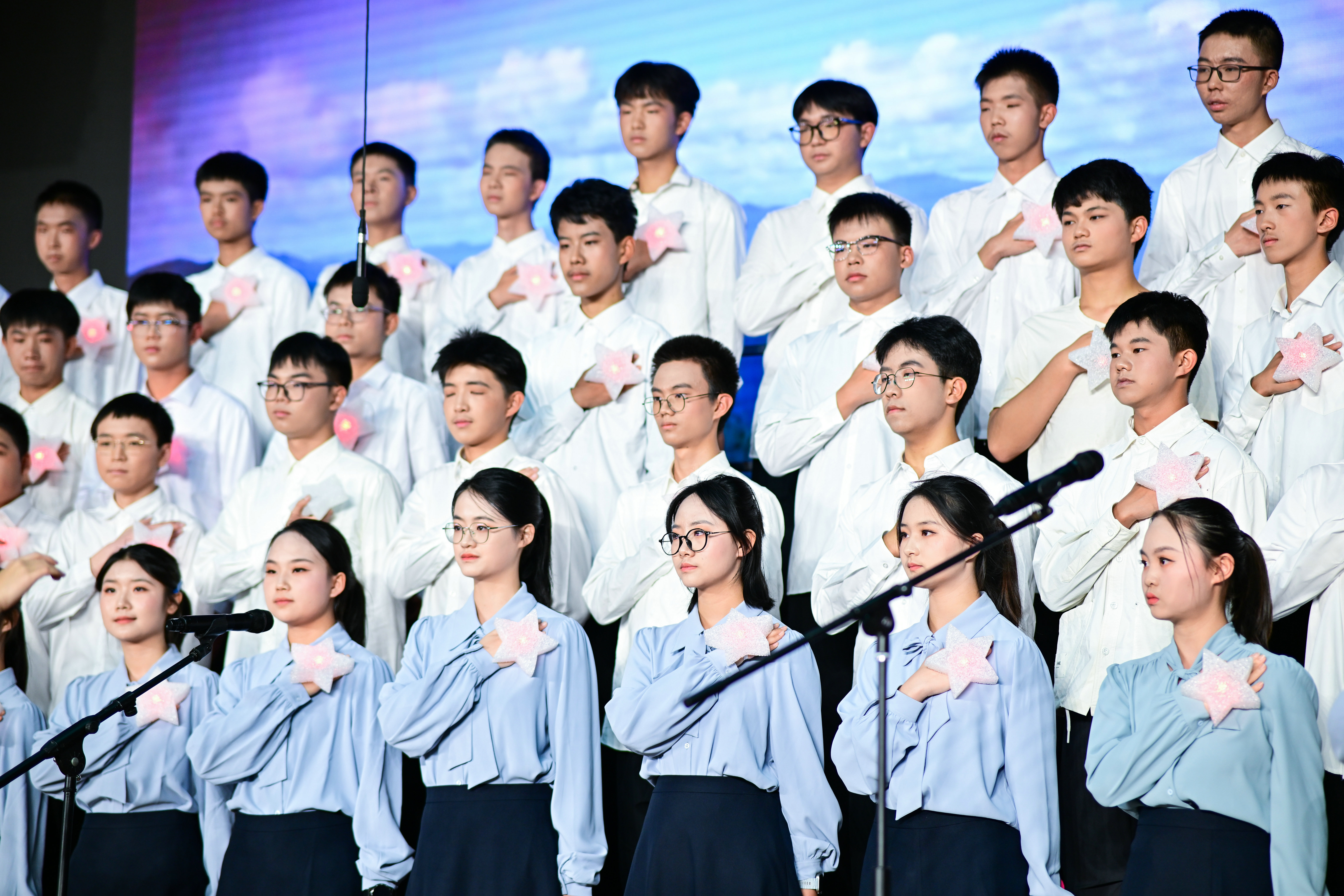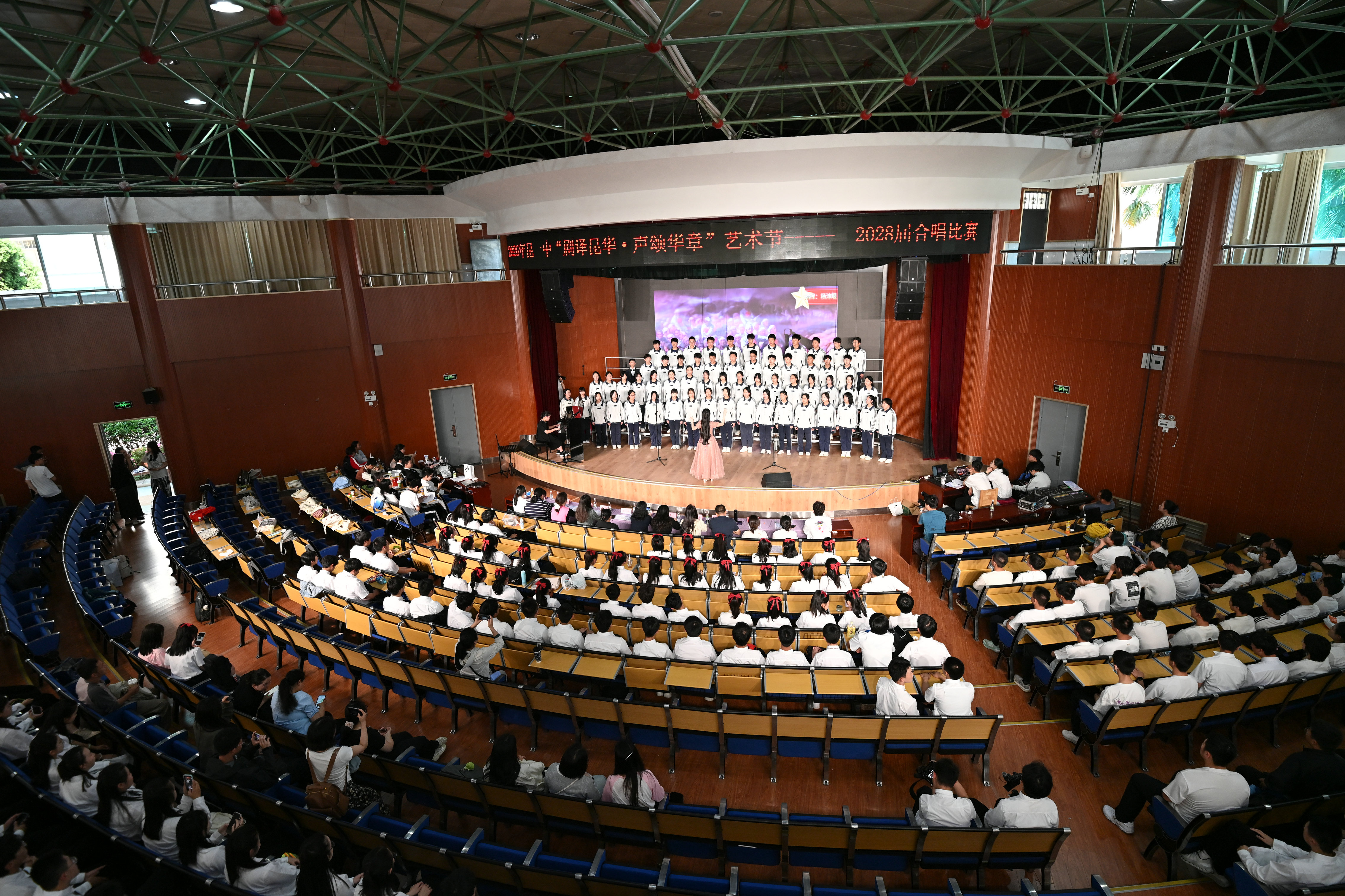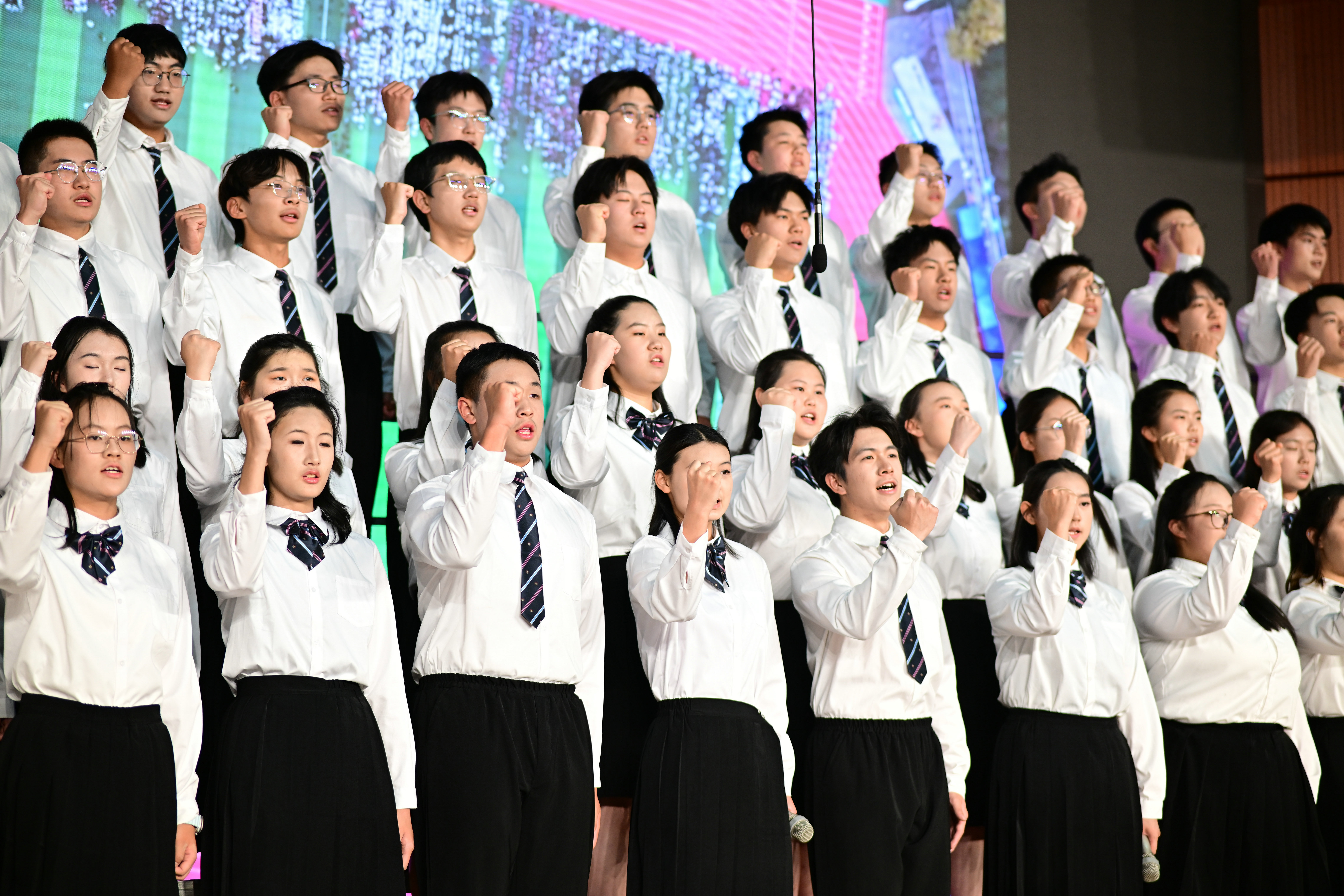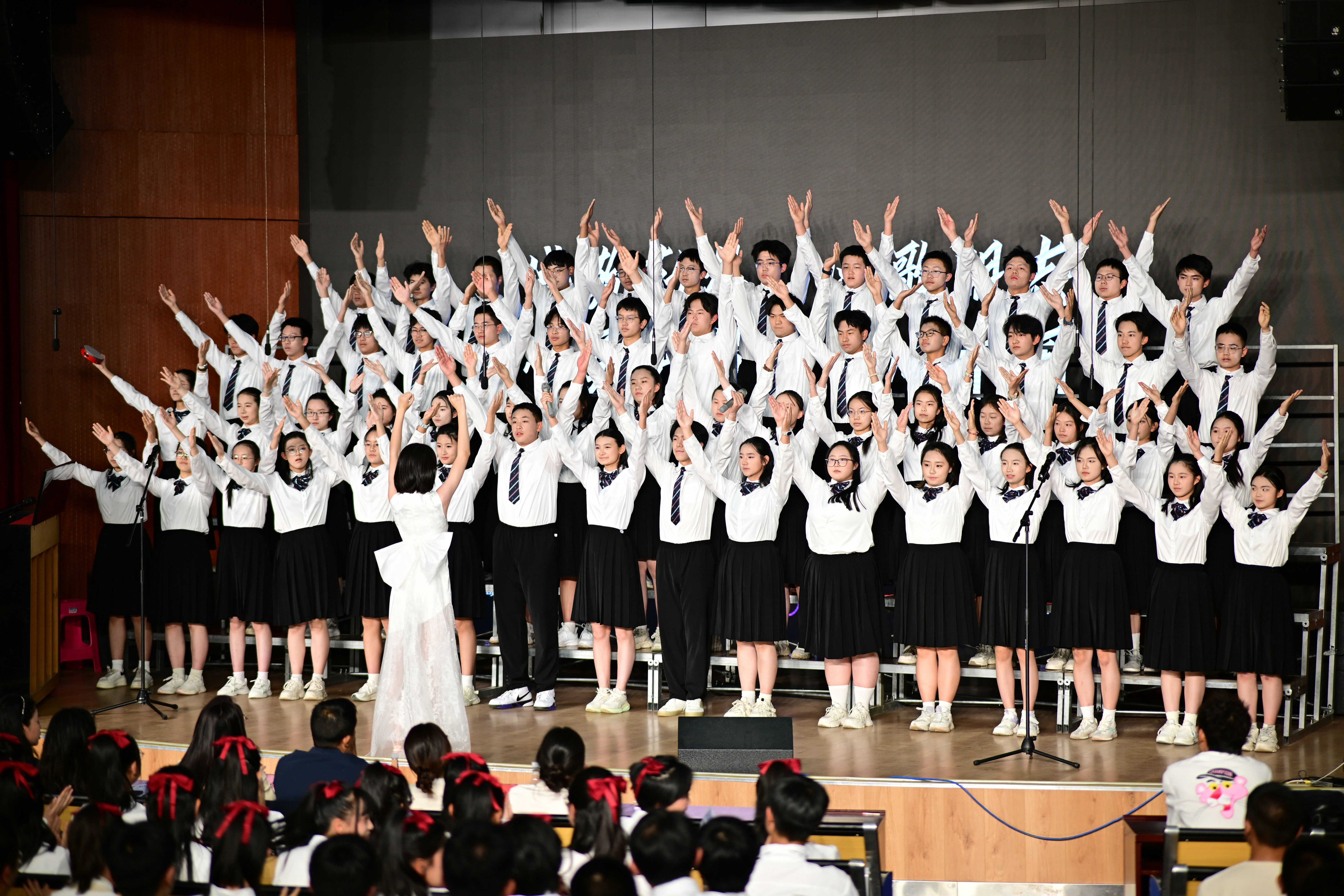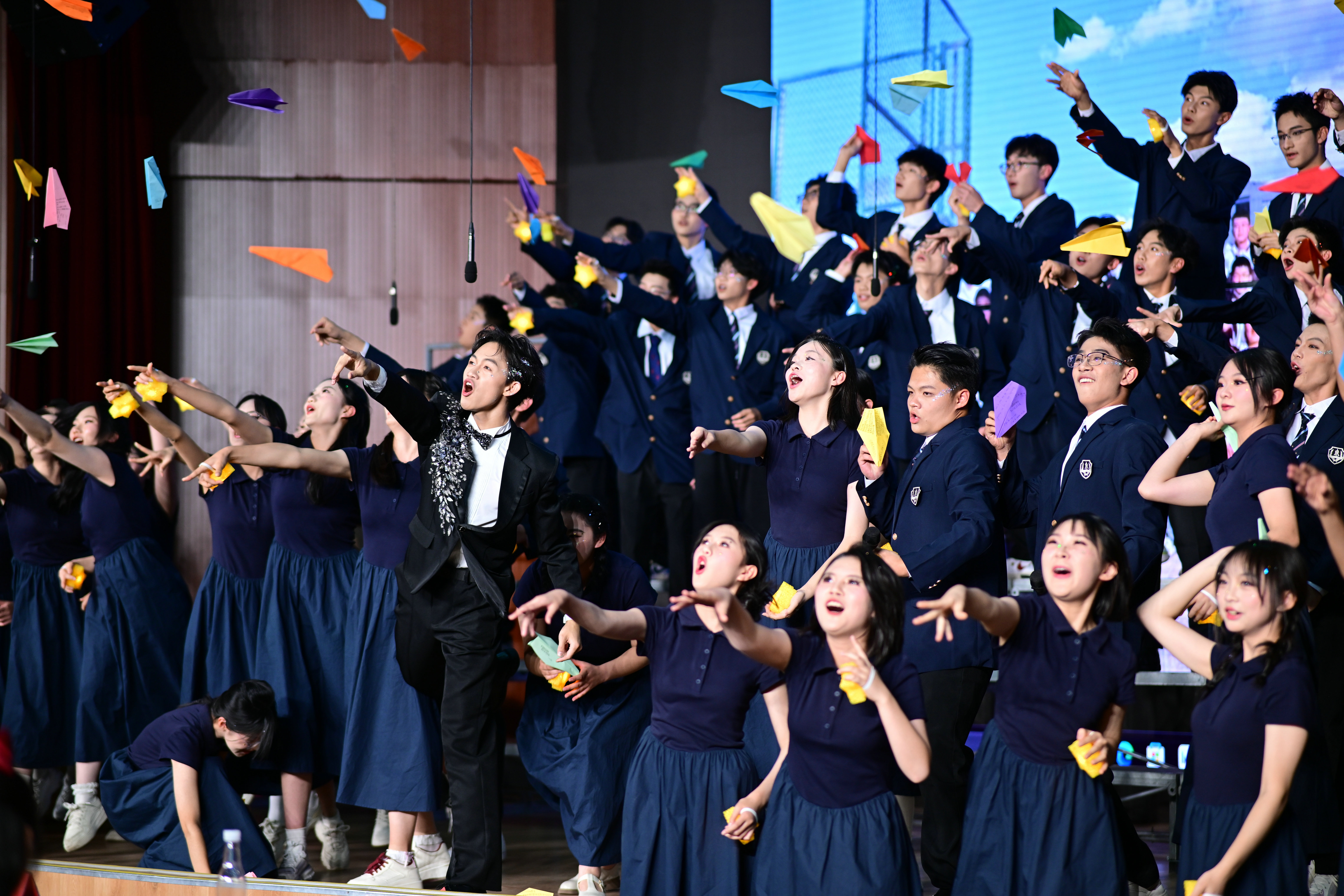 2班以《我是如此相信》为誓,以青春之名赴时代之约,怀揣热爱与勇气,坚定向前,始终追逐光、成为光;16班以《你从未离去》诠释同窗温情,前路相伴,情谊不散;8班以《紫荆花盛开》唱响紫荆盛放,情深意长,愿繁花永驻、山河无恙;14班《夜空中最亮的星》以歌声为灯,照亮前行之路;13班用《萱草花》传递温暖牵挂,刚柔并济间尽显少年的担当与柔情;11班以“有我”为志,以青春之名守护山河壮阔,奔赴未来征途;18班以《明天会更好》祈愿美好,借和平清泉的温润,传递对未来的无限期许,愿少年前程似锦,愿世间岁岁安康。