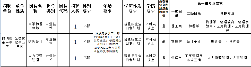 2016年,昆明市第一中学共招聘专业技术人员3名,高中物理教师1人、财务会计1人、人力资源管理1人。欢迎优秀高校毕业生报考。相关岗位信息、招考要求、方式详见昆明教育人才网《昆明市教育局直属学校(单位)2016年公开招聘工作人员公告》。有意应聘昆一中以上岗位者,可电话咨询:赖老师 65325980 郭老师 65312198